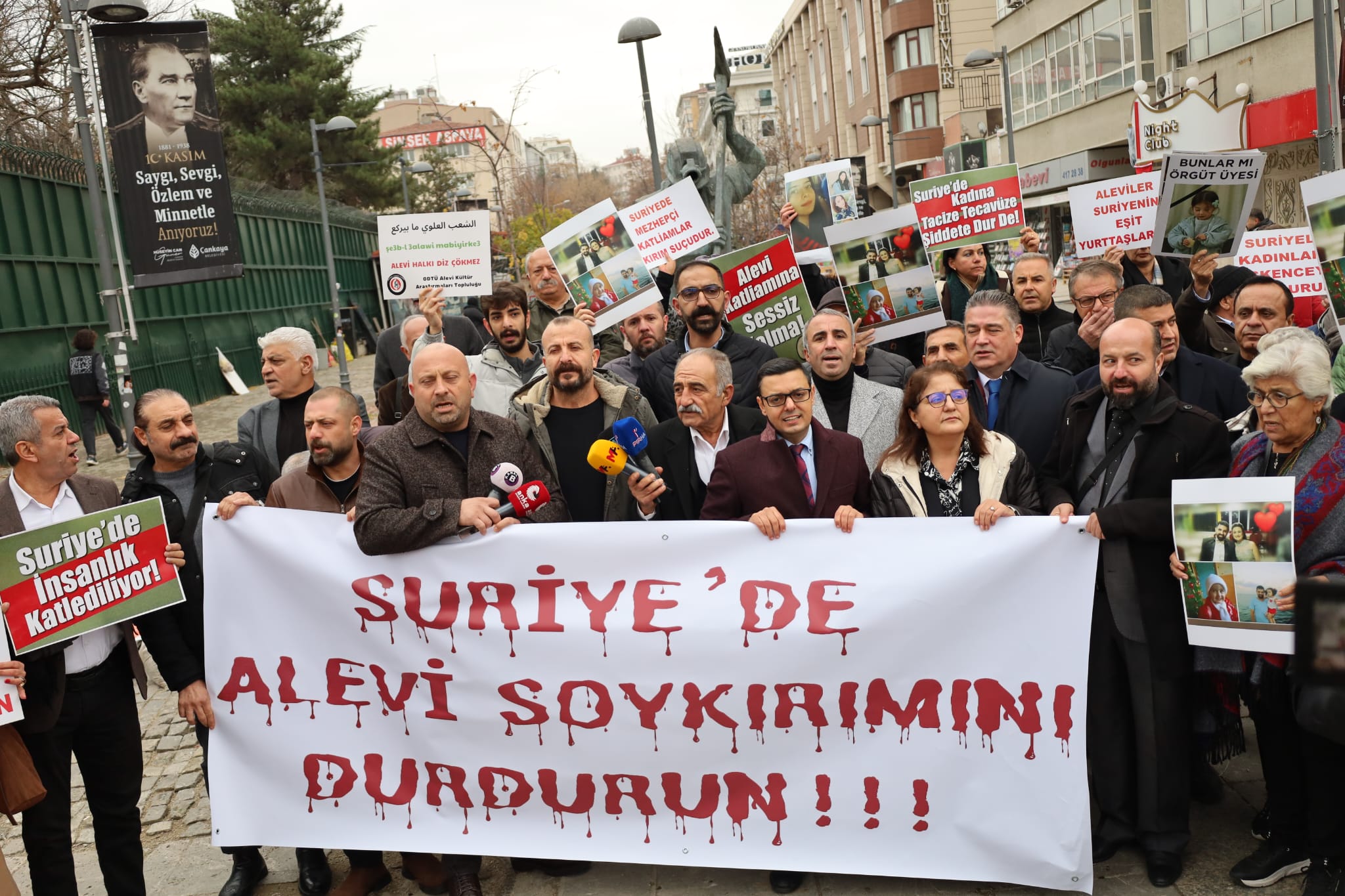 Temsîlkarê sazgeg û komelanê Elewîyanê Ereb ke şaristananê Edene, Hatay û Mersînî ra ameyê Anqara vera qirkerdişê elewîyanê Sûrîye vernîya Meclîsê Tirkîya de eşkerayî daye. Girseyo ke waşt verê berê Çankaya yê Meclîsî de eşkerayî bido hetê polîsan ra ame astengkerdene. Ney ser o girse hemverê Meclîsî de eşkerayî daye. Endam û tamsîlkarê partîyanê sîyasî, komele, sazgehê elewîyan û Parlamenterê DEM Partî Ayten Kordu, Perîhan Koca û Celal Firat zî beşdaeê eşkerayî bîyê. Eşkerayî de pankarto ke ser o “Qirkerdişê vera Elewîyanê Sûrîya vindarnê” nuştebi, ame girewtene.