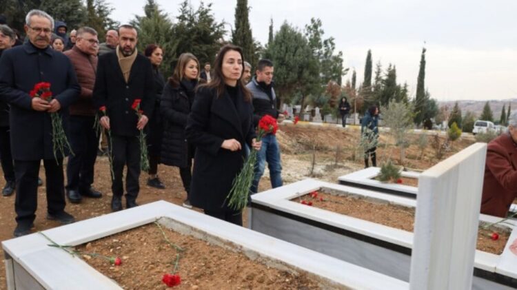 Hemsereka DBP’yî ya Pêroyî Çîgdeme Kiliçgun Uçar û Hemsereka DEM Partî ya Pêroyî Tulaye Hatîmogullarî, erdlerzê 6ê sibata 2023î de Semsûr de kesê ke cuya xo ra bîyî, gorîstanî de yad kerdî.