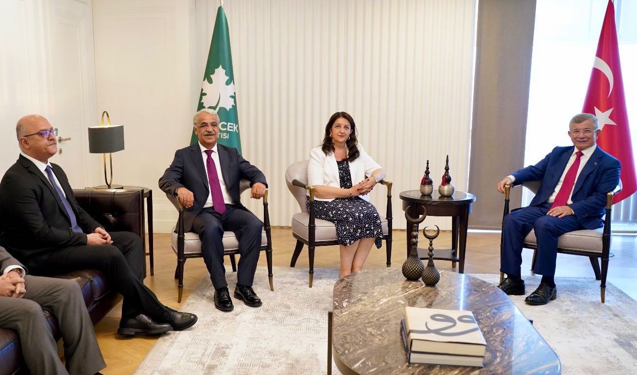 Heyetê Îmralîyî yê Partîya Têduştî û Demokrasîyî ya Şaran (DEM Partî) ke parlamenter Pervîn Buldan, Mîthat Sancar û avûkatê Buroyê Huqûqî yê Seserrî Faîk Ozgur Erolî ra yeno pê, do siba Serekê Pêroyî yê Partîya Gelecekî Ahmet Davutoglu reyde pêvînayîş bikero.