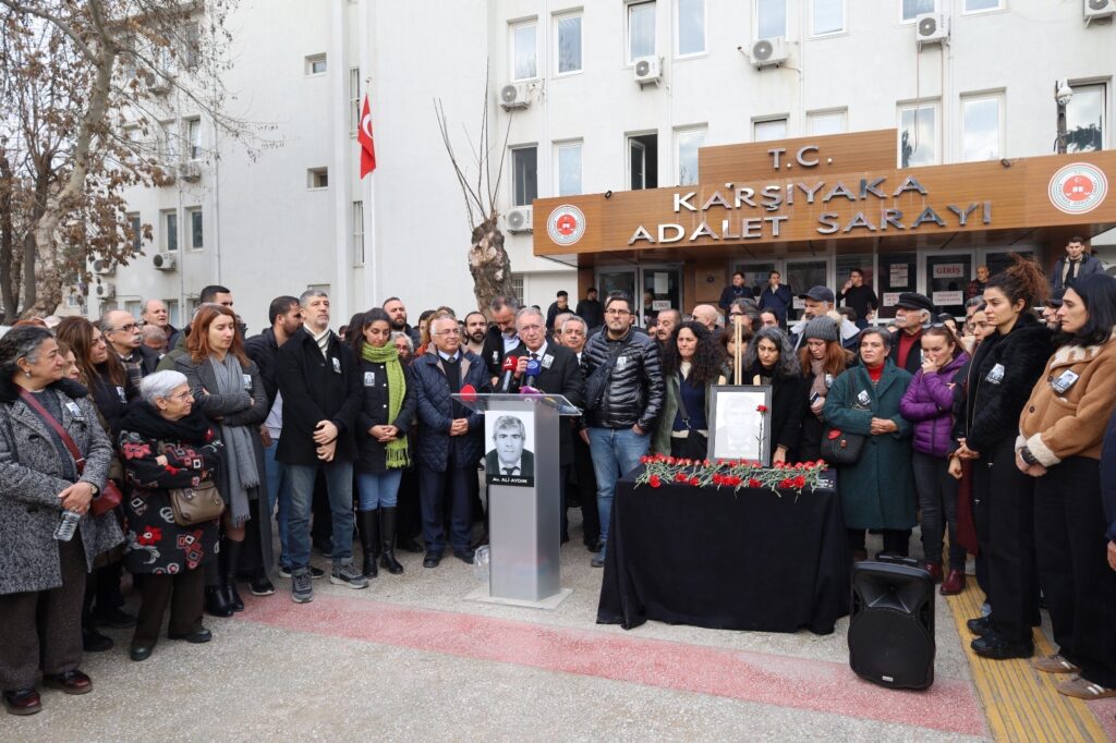 Eşkerayî de keyeyê Alî Aydinî, Hemserekê Şubeyê ÎHDyî yê Îzmîrî Cîhan Aydin, Serekê Baroya Îzmîrî Sefa Yilmaz, Hetkarê Hemserekanê Pêroyîyan ê DEM Partî Ozturk Turkdogan, temsîlkarê partîyanê sîyasîyan, temsîlkarê sazîyanê sivîlan û xeylê kesî tewrê eşkerayîye bîyî. Eşkerayîye de sloganê “Alî Aydin rûmetê ma yo”, “ÎHD bêveng nêmaneno û nêmaneno” ameyî berzkerdene.
