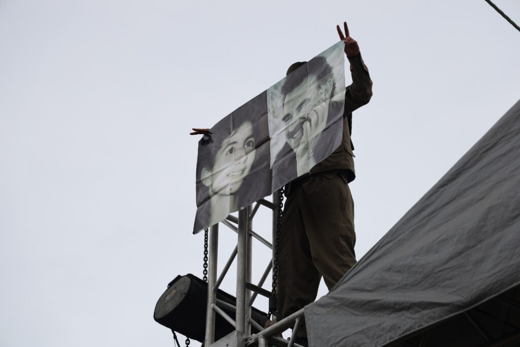 Warî ra posterê Rayberê Şarê Kurd Abdullah Ocalanî ameyî akerdene û ciwanan tîşortê ke resmê Ocalanî ser o yê, xo ra dayo. Şîarê “Bijî Serok Apo” warî de veng dano.