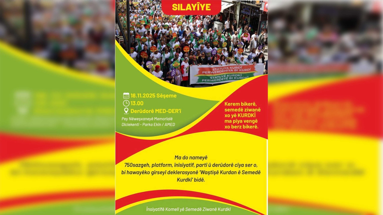 Înîsîyatîfê Komele yê Semedê Ziwanê Kurdkî do semedê waştişê şarê kurdî yê derheqê ziwanê kurdkî de bi îmza û beşdarîya zêdeyêr 750 sazî, dezgeh, platform, partî û dorê kurdî û demokratîkan ê komelî yê Vakurê Kurdistan û Tirkîya de 18ê teşrîna peyêne saete 13:00ine de Parka Ekîn Cerene ya qezaya Peyasî ya Amedî de bi tewrê girseyî deklarasyonêk rayapêroyî rê pare bikerê.