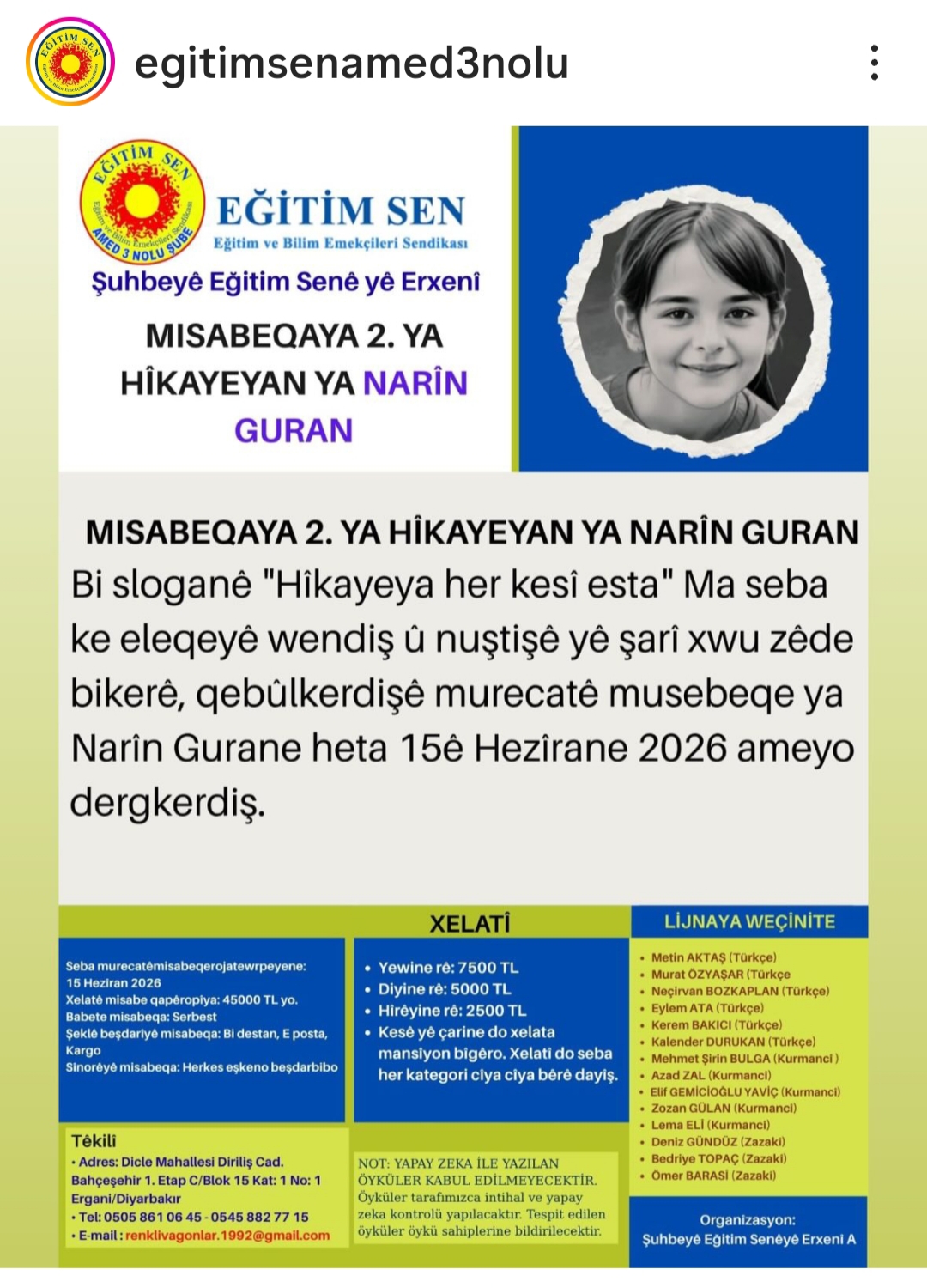 Şubeyê Egîtîm Senî yê Erxenî seba vîrardişê Narîn Guran bi sloganê, “Hîkayeya her kesî est a “Musabeqaya Hîkayeyan a Narîn Guran a 2.” organîze keno. Şubeyî dîyar kerd ke wextê muracatanê “Musabeqaya Hîkayeyan a Narîn Guran a 2.” seba eleqayêka girde ameyo dergkerdene. Wextê muracatan heta 15ê hezîrana 2026î ameyo dergkerdene.