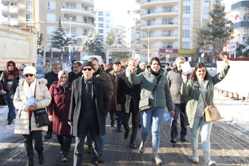 Sûr de zî endamê Platformê Sazgehanê Demokratîk, DEM Partî û DBP’yî kuçe bi kuçe gêrayê û şarî silayna mîtîng.
