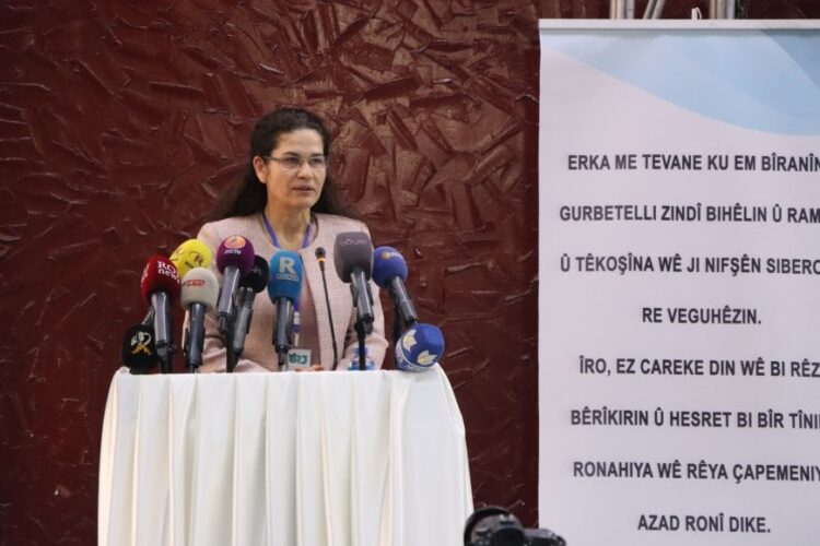 Hemseroka Dayîreyê Têkilîyanê Teberî yê Herêma Xosere ya Vakur û Rojhelatê Sûrîye Îlham Ehmed, Konferansê Yewîyeya Resnayîşî ya Cinîyan ê 4. (Yekitiya Ragihandina Jin – YRJ) o ke Unîversîteya Rojawanî ya Qamişloyî de ame viraştene de qisey kerd.