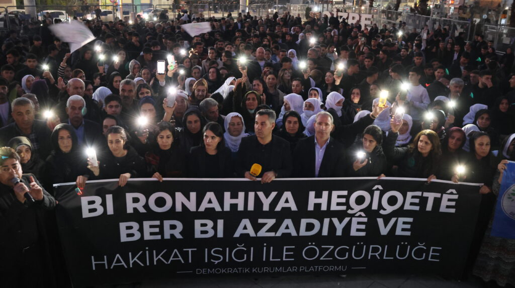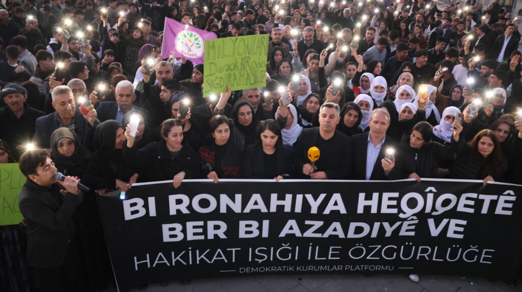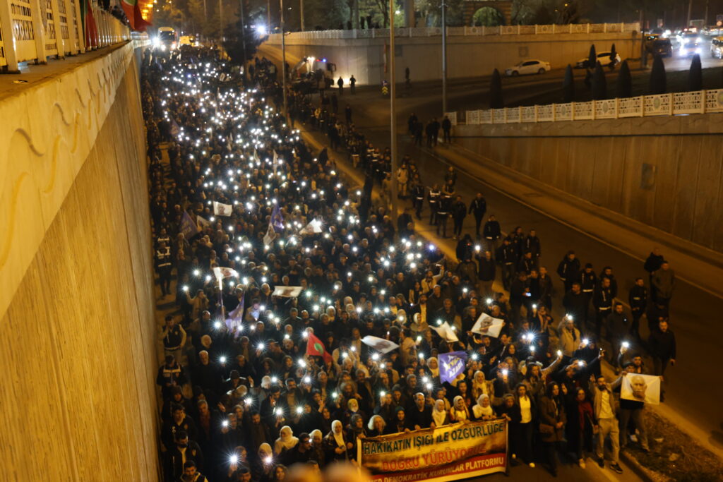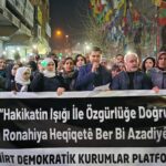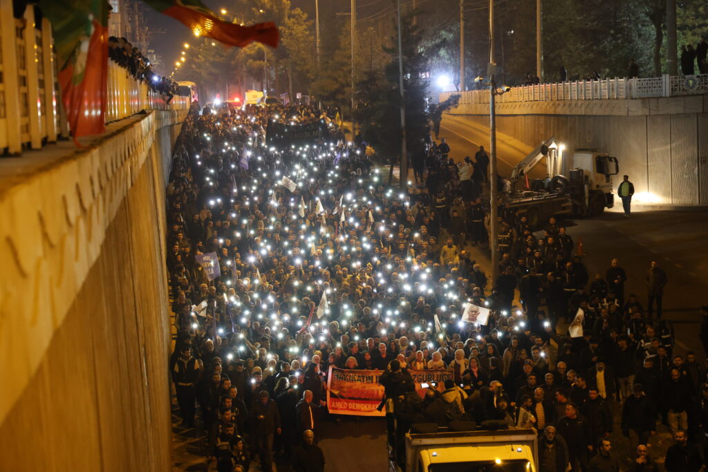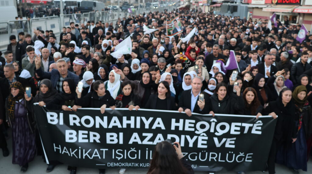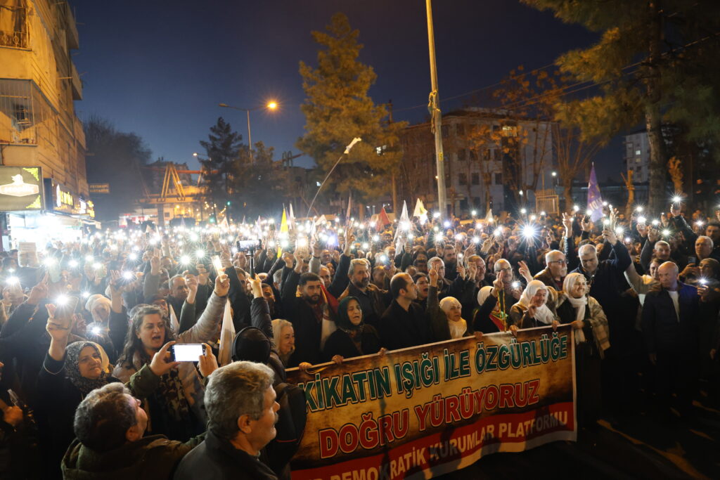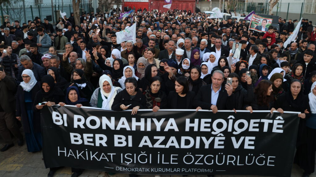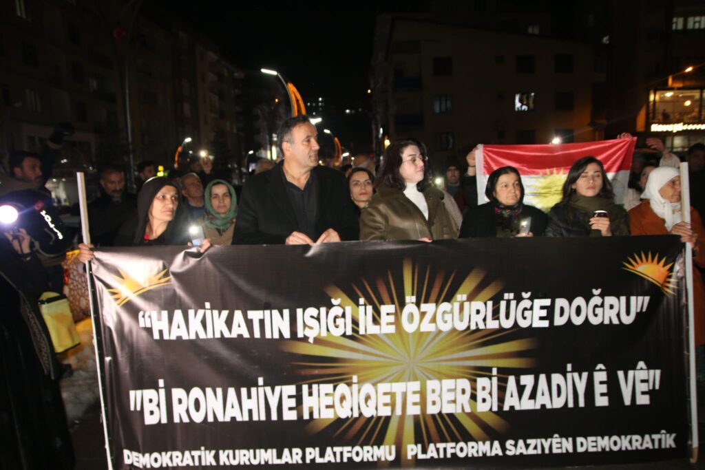 Di pêşengtiya Platforma Saziyên Demokratîk de bi boneya salvegera komploya 15ê Sibatê ya Navneteweyî ya li dijî Rêberê Gelê Kurd Abdullah Ocalan hate pêkanîn bi dirûşma “Bi ronahiya heqîqetê ber bi azadiyê ve” li Amedê meşek hate lidarxistin. Hevserokê Partiya Herêmên Demokratîk (DBP) Keskîn Bayindir, endam û rêveberên partiyên siyasî, saziyên sivîl ên civakî û bi sedan kes beşdarî meşê bûn. Girseya ku li ber Bîrdariya Mafên Mirovan a Koşûyolûyê kom bû, alên ku wêneyê Rêberê Gelê Kurd Abdullah Ocalan li ser hilgirtin. Di meşê de pankartên “Kes nikare tu carî roja me tarî bike” û “Bi ronahiya heqîqetê ber bi azadiyê ve” hatin hilgirtin û ronahiyên telefonan hatin vekirin. Girseyê di meşê de her tim dirûşmên “Bijî Serok Apo” , “Bê Serok jiyan nabe” , “Silav silav ji Îmraliyê re hezar silav” , “Bijî berxwedana Rojava” û “Jin jiyan azadî” berz kir.