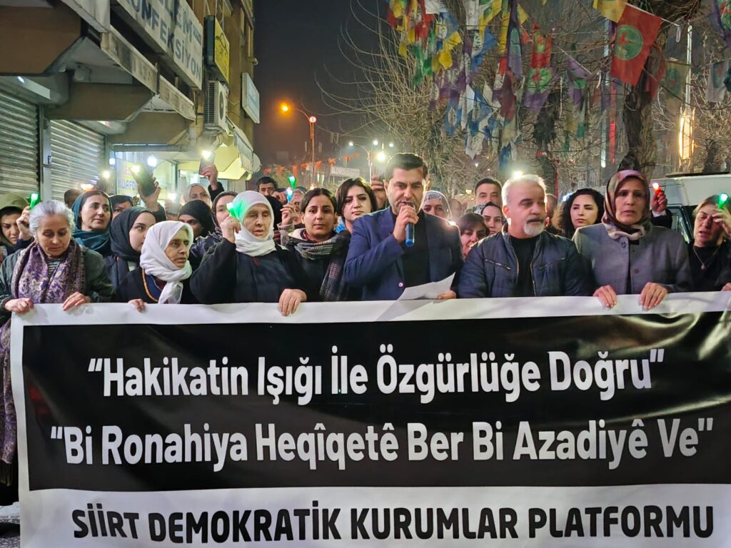Platforma Ked û Demokrasiyê ya Şirnexê jî bi heman armancê çalakî pêk anî. Nûnerên partiyên siyasî, saziyên sivîl û gelek welatî li ber Rêxistina Navçeya Cizîrê ya DEM Partiyê kom bûn. Girseya pankarta, “Bi ronahiya heqîqetê ber bi azadiyê ve” vekir, dowîzên, “Bijî Serok Apo” û “Bê Serok jiyan nabe” vekirin. Girseya heta Çerxereya Dortyolê meşiya sloganên, “Bê Serok jiyan nabe” û “Silav silav ji Îmraliyê re hezar silav” berzkirin. Welatiyan ronahiyên telefonên xwe pêxistin û tarîtiya şevê ronî kirin. Piştî meşê daxuyaniyek hate dayîn. Daxuyanî bi merasîma rêzgirtinê dest pê kir. Hevserokê DBP’ê yê Cizîrê Bager Aşkin di axaftina xwe de diyar kir ku heta Rêberê Gelê Kurd Abdullah Ocalan azad nebe, kes azad nabe. Piştî wî, Hevserokê DEM Partiyê yê Cizîrê Yilmaz Sanri metna hevpar xwend û destnîşan kir ku komplo têk çûye û Abdullah Ocalan bi ser ketiye. Parlamentera Şirnexê ya DEM Partiyê Newroz Uysal Aslan jî komploya navneteweyî şermezar kir û ev tişt got: “Gelê Kurd her sal li dijî komployê li qadan e. Yahya Menekşe berî 15 salan dema komplo şermezar dikir hat qetilkirin. Em wî bi rêzdarî bi bîr tînin. Me ev komplo nas nekiriye û em ê nas nekin. Ne komploya 15’ê Sibatê û ne jî komployên li ser Rojava, em tu carî qebûl nakin. Gelê Cizîrê dê her tim xwedî li îradeya xwe derkeve. Heta ev roja reş bibe ronahî, em ê têkoşînê berdewam bikin. Kurdan li Rojava bersiva komployê da. Îro dixwazin komployê nû bikin, lê gelê Kurd dê li dijî vê heta dawiyê li ber xwe bide.”