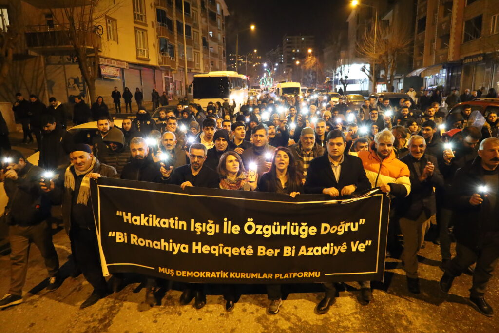 Platforma Saziyên Demokratîk a Mûşê ji bo protestokirina Komploya Navdewletî ya 15ê Sibatê meşek meşaleyî li dar xist û daxuyaniyek da. Girse li ber navenda tenduristiyê ya taxa Yeşîlyurtê kom bû û heta xaçerêya Fîdanlikê meşiya. Di meşê de girseyê dirûşmeyên “Hezar silav ji Îmraliyê re” û “Bê Serok jiyan nabe” berz kirin.