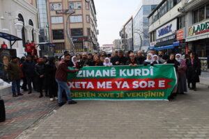 KURDÎGEHê, têkildarî kreşa zarokan a bi navê “Perperok Mala Zarokan” ku ji aliyê qeyûm ve tabelaya wê hatiye guhertin, li Kolana Hunerê ya li navçeya Rêya Armûşê ya Wanê daxuyaniyek da. Di daxuyaniyê de pankarta “Zimanê Kurdî xeta me ya sor e destê xwe jê vekişînin” hat vekirin û dirûşmeyên “Bê ziman jiyan nabe”, “Ziman jiyan azadî”, “Bê kurdî jiyan nabe” hatin berzkirin. Parlamenterên DEM Partiyê, Hevşaredarên Bajarê Mezin ên Wanê Neslîhan Şedal û Abdûllah Zeydan, endam û rêveberên partiyên siyasî, nûnerên saziyên sivîl û partiyên siyasî tev li daxuyaniyê bûn.
