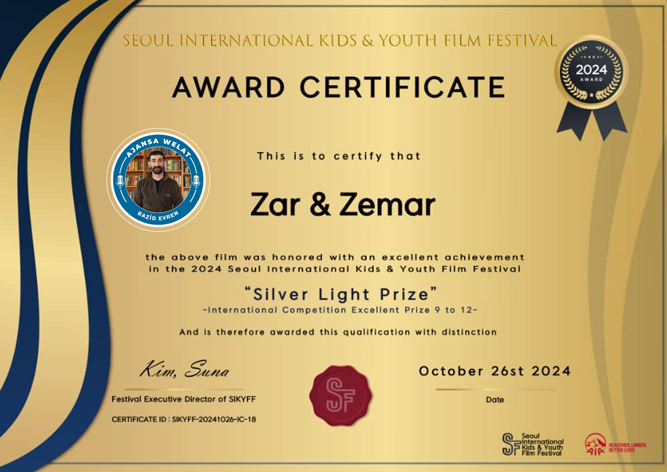 Wan – Kurtefîlma derhênera Kurd Xecê Rêdûr a bi navê “Zar û Zemar” ku fîlma ewil a derhêner e û li ser mijara mafên mirovan disekine, di du mihrîcanan de xelat wergirt.