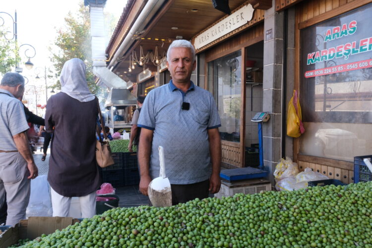 Firoşkar Mehmet Murat Kizilay ê ku ji sala 1978an vir ve karê esnaftiyê dike û bi firotana zeytûnan re eledar dibe wiha got: “Ev zeytûn ne yên xirxalî ne, yên xirxalî hem biha û hem jî qaliteya wan li gorî yên din baştir in. Heta 10-15 rojan zeytûnên xirxalî jî dê bigihêjin. Bi piranî milet wan distîne. Yên ku em difiroşin bihayê wan erzan û xwarina wan jî xweş e. Du roj-sê rojan carekê em bi tonan tînin gelek caran heta êvarê namînin. Ev zeytûn jî yên Dêrika Çiyayê Mazî ne. Di heman demê de ji Hatayê jî tên. Kîloya wan jî bi 90 lîreyî tê firotin. Yên Dêrikê carinan bi 150-200 lîreyî tên firotin û qalîteya wan baştir e. Dema ku bikirên me pir bin em gelek caran rojê du tonan jî diqedînin. Zeytûn di quranê de jî derbas dibe, ji bo tendirustiyê gelek baş e. Ji bo laşê mirovan gelek feydeyên wê hene. Rûnê zeytûnan bixwe jî ji van zeytûnên şîn derdikevin. Dema çavên bikiran bi bihayê zeytûnan dikevin ku ji wan re biha ye, gelek caran em bihayê wan dadixin. Carinan jî em bi heman bihayî difiroşin. Bihayê zeytûnên reş bûye 300-400 lîre, yên şîn jî bi 90 lîreyî ne. Ji ber ku erzan in milet bi piranî yên şîn distîne.”