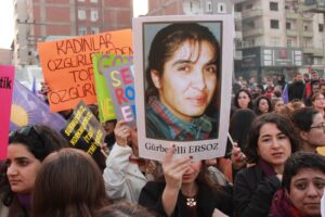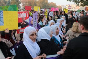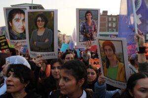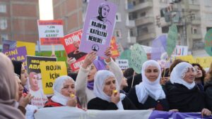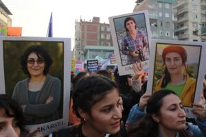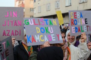 Di meşê de pankarta “Bi jiyana bêtundî ber bi civaka demokratîk ve” vekirin. Jinan dovîzên “Bijî yekitiya jinan”, “Jin bi tekoşînê azad dibin”, “Jinên azad, civaka azad” û wêneyên Gurbetelli Ersoz, Nagîhan Akarsel, Cîhan Bîlgîn û jinên hatine qetilkirin hatin hilgirtin. DI meşê de bênavber dirûşmeya “Bijî Serok Apo” hat berzkirin.
