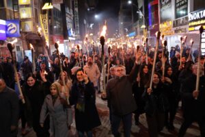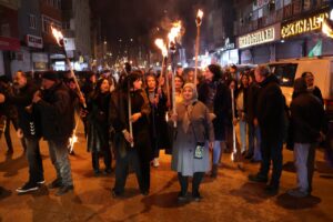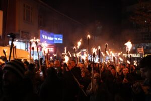 Ji ber ku Rêberê Gelê Kurd Abdullah Ocalan di 4ê Nîsanê de dikeve 77 saliya xwe, girseyê 77 meşale hilgirtin. Di dema meşê de dirûşmên wekî “Bijî Serok Apo” û “Bê Serok jiyan nabe” hatin berzkirin.