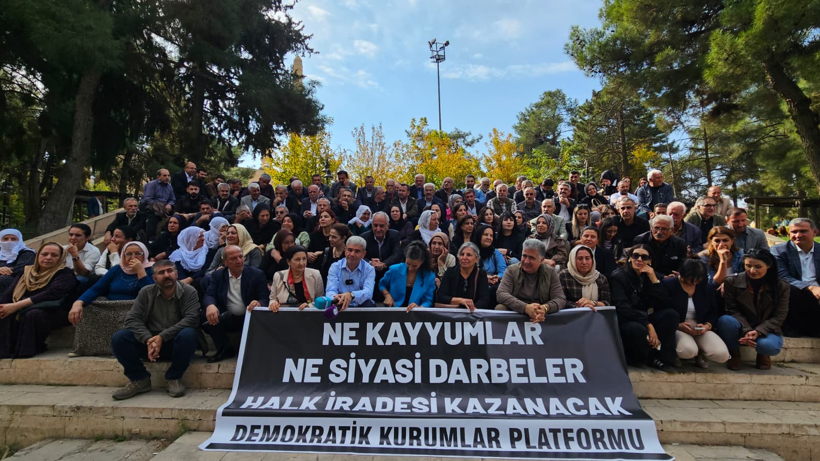 Platforma Saziyên Demokratîk a Mêrdînê li Parka Karayollariyê ya navçeya Artûklûyê bi tevlibûna endam û rêveberên partiyên siyasî û saziyên civaka sivîl daxuyanî da. Di daxuyaniyê de pankarta, “Ne qeyim ne darbeyên siyasî, gel wê serbikeve” hat vekirin.