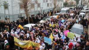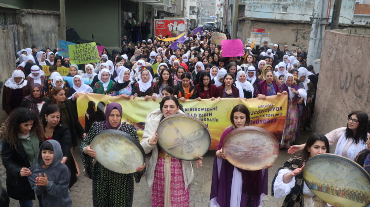 Piştî pîrozbahiya bi coş, jin bi pankartek ku li ser “Em bi berxwedanê û bi destxistina azadiyê civatek demokratîk ava dikin” ber bi avahiya navçeya DEM Partiyê ve meşiyan.