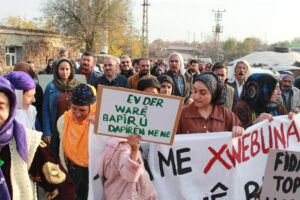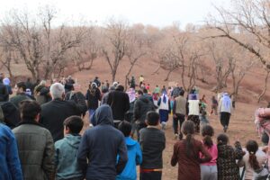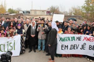 Piştî axaftinê girse ji nav gund heya gire ku kan lê hatiye çêkirin meşiyan. Di meşê de pankarta “Xwezaya me xwebûna me ye, em dest jê bernadin” û dowîzên “Em hemberê talanê xweza û jiyana xwe diparêzin” û “Evv der warê bapîr û dapîrên me ne” hatin hilgirtin.
