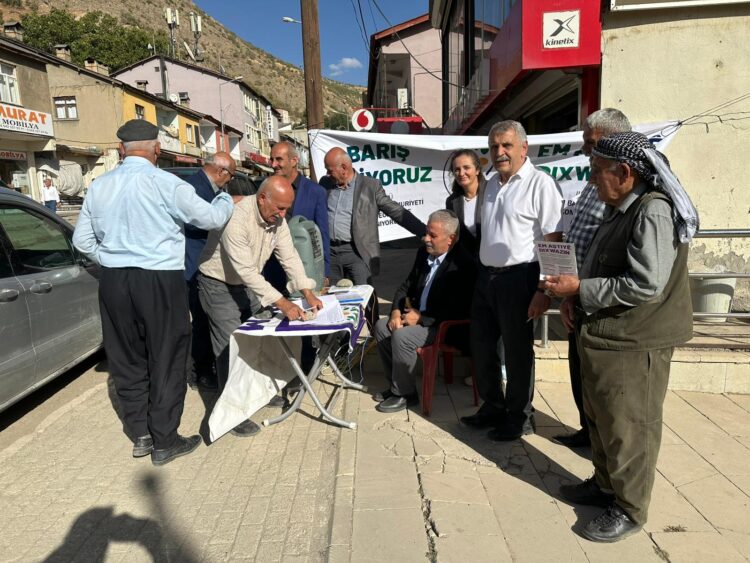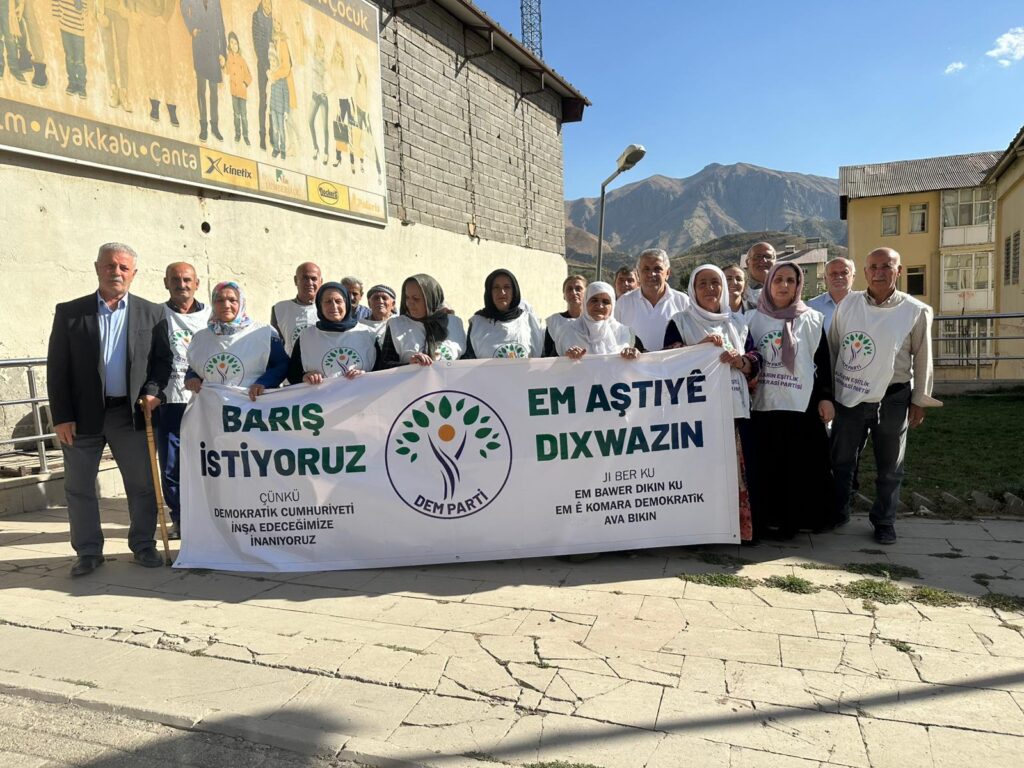 DEM Partiyê li navçeya Elkê ya Şirnex bi banga, ‘Em aştiyê dixwazin ji ber ku’ stand vekirin. Gelek welatî li ber avahiya DEM Partiyê kom bûn û heya avahiya postexaneyê meşiyan û diruşma, “Bijî aştî” berz kir. Li Hevserokê DEM Partiyê yê Elkê Xalid Ataman diyar kir ku wan ji ber aştiyek bi rûmet ev stand vekiriye.