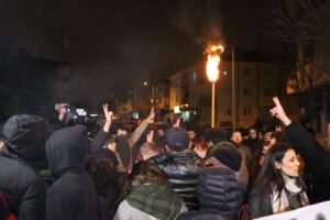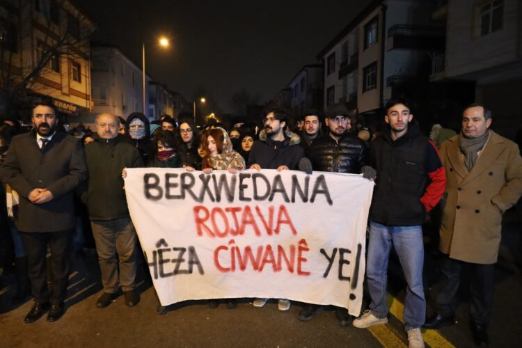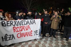 Polîsan girseyê dorpeç kir û hewl dan çalakiyê asteng bikin. Girse di bin dorpeçê de pankarta li ser, “Berxwedana Rojava heza ciwanan e” vekirin û meşale pêxistin. Girseyê wêneyê fermandar Zeyad Heleb ku li Şêxmeqsûd jiyana xwe ji dest dabû rakirin û dirûşmeyên,”Bijî berxwedana Rojava”, “Rojava Rojhilat e Kurdistan yek welat e”, “Kurdistan wê ji faşîştan re bibe goristan” û “Jin jiyan azadî” berz kirin.