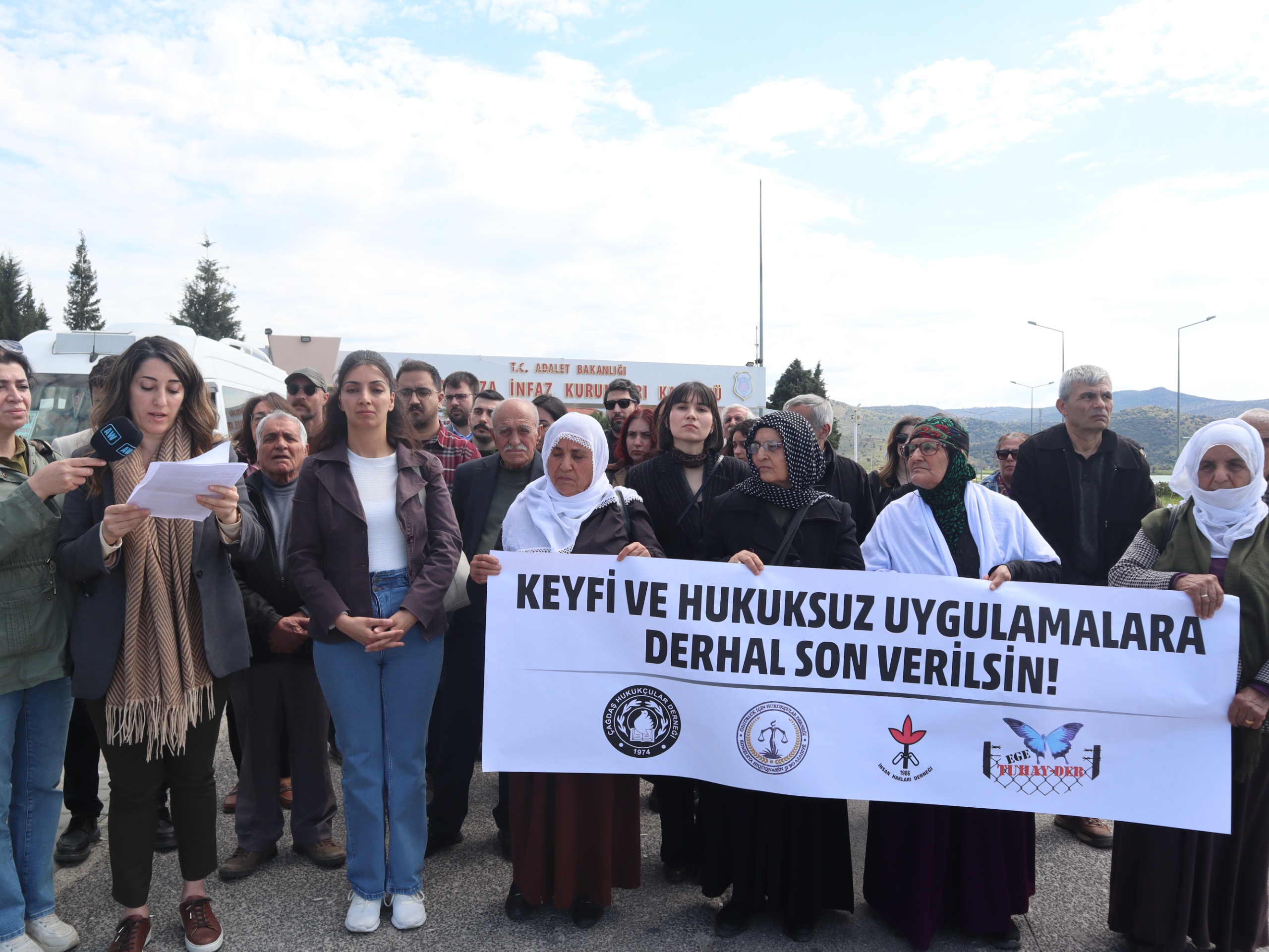 Komeleya Hiqûqnasên ji bo Azadiyê (OHD), Komeleya Hiqûqnasên Hemdem (ÇHD), Komeleya Mafên Mirovan (ÎHD) û Komeleya Alîkarî û Piştevaniya bi Malbatên Girtî û Hikûmxuran re ya Egeyê (EGE-TUHAYDER), derbarê binpêkirinên mafan ên li Girtîgeha Jinan a Alîagaya Îzmîrê li ber girtîgehê daxuyanî dan çapemeniyê. Di daxuyaniyê de pankarta “Bila dawî li sepanên kêyfî û derqanûnî bê anîn” hat vekirin. Metna daxuyaniyê ji aliyê Hevseroka Şaxa OHDa Îzmîrê Fatma Demîrer ve hat xwendin.