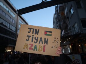 Berfîn Tunç di dawiya daxuyaniyê de destnîşankir ku jin di têkoşîna ekolojî û mafên ajalan de jî jiyanê diparêzin û got: “Polîtîkayên şer li her derê cîhanê bedena jinan hedef digre. Li Xezeyê, li Rojava, li Îran, li Afganistan û li Sûriyeyê jin bi şîdet, sirgûn, xizanî û zextan re rû bi rû dimînin. Em dizanin ku êrîşkariya emperyalist û siyonist wekî ku îdia dike ‘azadiyê ji jinan re’ nayîne. Azadiya jinan bi destên wan ên bi xwîn nayê. Em jinên ku di aştiyê de bi israr in; jinên Tirk, Kurd, Ereb, Suryanî, Êzidî û LGBTI+ bi hev re xeteke aştiyê ya ku sînoran ji holê radike hûnand. Ev xet li dijî nijadperestî, mezhepgerî, zayendperestî, homofobî û transfobiyê xeta parastina jiyanê ye. Me li vê axê jî li dijî şerê ku zêdetirî çil sal in berdewam dike, tu carî dest ji gotina ‘Aştî’ û ji têkoşîna hevpar a ji bo aştiyê berneda. Tenê bi rawestandina çekan aştiyê nayîne. Bi domandina polîtîkayên ewlehiyê, sepanên antî-demokratîk û rê li ber girtina daxwazên gelê Kurd û raya giştî ya demokratîk, dê dewlet nagihîje tu derî.”