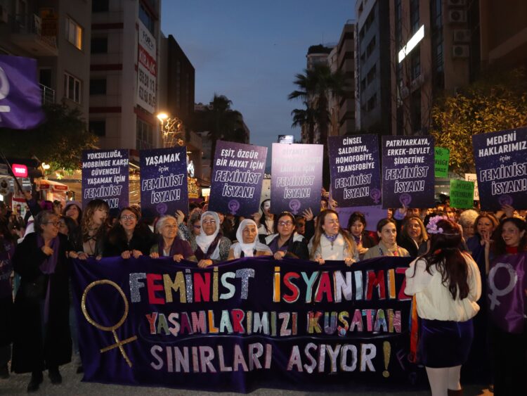 Di çarçoveya 8ê Adarê Roja Jinên Kedkar ên Cîhanê û 9emîn Meşa Şevê ya Femînîst a Îzmîrê bi sedan jin hatin cem hev û ji ber Pirtûkxaneya Penguen a kevin a li Alsancakê kom bûn û ber bi Navenda Çanda Turkan Saylan ve meşiyan. Di meşê de pankarta “Serhildana me ya feminîst sînorên ku jiyana me dorpêç dike ji holê radike” hat hildan û gelek caran dirûşmên “Bijî berxwedana jinan”, “Jin, jiyan, azadî”, “Bijî piştgiriya jinan” û “Jin şer naxwazin, aştiyê dixwazin” hatin berzkirin. Parlamentera DEM Partiyê ya Îzmîrê Burcugul Çubuk û bi sedan jin tevlî meşê bûn. Daxuyanî bi kurdî ji aliyê Berfin Tunç ve, bi tirkî jî ji aliyê Baran Alan û Yagmur Çelîk ve hat xwendin.