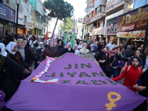 Jinên ku li pêşiya Îskeleya Karşiyakayê civiyan, ber bi rawestgeha Îzbanê ya Karşiyakayê ve dest bi meşê kirin. Di meşê de pankartên “Em bi berxwedanê azad dibin û civaka demokratîk dihonin” û “Jin, jiyan, azadî” hatin hilgirtin. Jinan bê navber dirûşmên “Bijî berxwedana jinan”, “Bijî berxwedana Rojava” û “Bijî piştevaniya jinan” berz kirin. Aktîvîsta TJAyê Ayla Akat Ata, parlamenterên DEM Partiyê Sumeyye Boz û Burcugul Çubuk û gelek jin beşdarî çalakiyê bûn.
