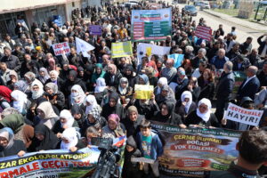 Di meşê de pankartên “Em ê jîyanê bi parêzin” , “Em ê rê nedin jeotermalê”, “Em jeotermalê naxwazin” hatin vekirin û her wiha dowîzên “Pişgirtî dide jiyandin”, “Ne Tonî, ne Conî, ne HES, ne jî JES gerek bibin yek herkes” , “Parastina gundê me parastina pêşerojê ye” hatin rakirin. Dirûşmên “Bêdeng nemîne hûn bêdeng bimînin dê dor were we” , “Em ê bi berxwedanê serbikevin” hatin berzkirin.