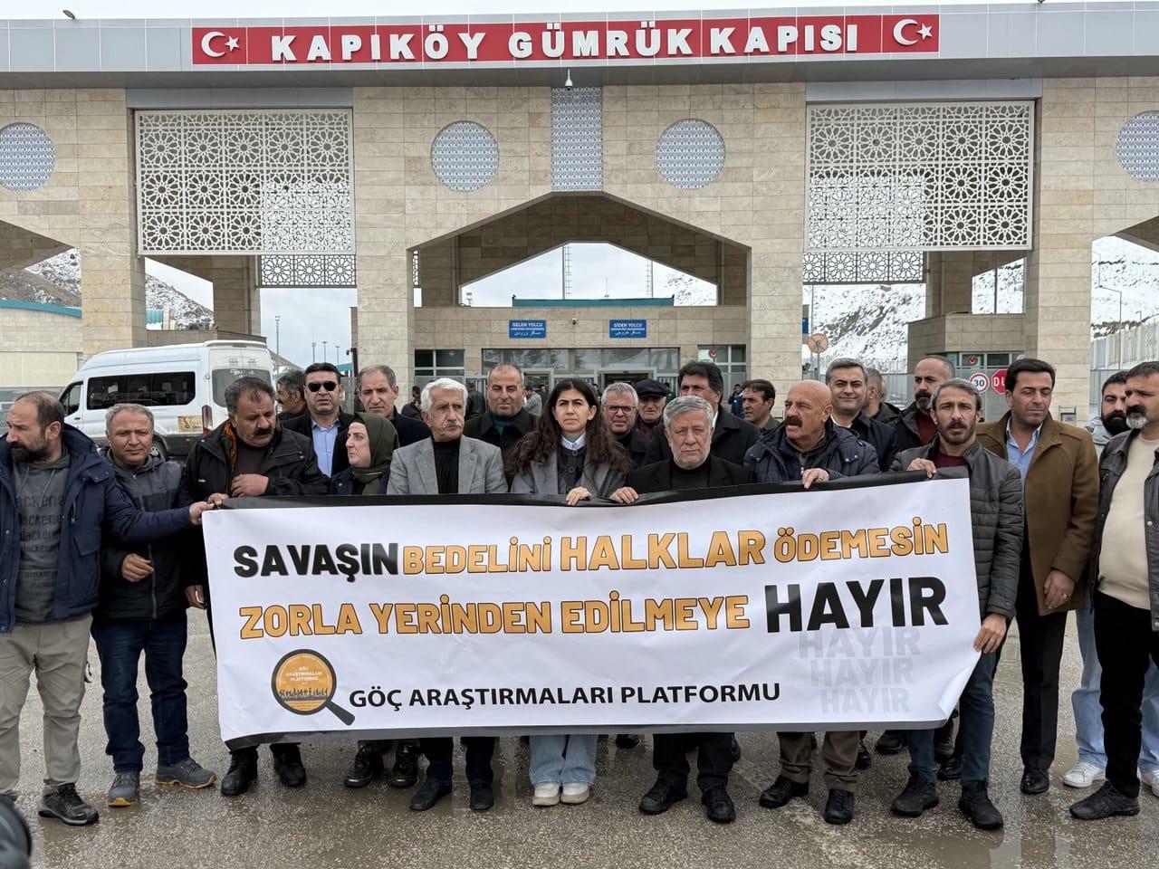 Platforma Lêkolînên Koçberiyê, têkildarî êrişên Îsraîl û DYAyê yên li ser Îranê û pêla koçberiyê ya ku dibe ku rû bide, li navçeya Seravê ya Wanê, li ber deriyê Kapikoyê ku di navbera Rojhilat û Bakurê Kurdistanê de ye daxuyanî da çapemeniyê. Di daxuyaniya ku pankarta “Bila gel berdêla şer nedin. Ji koçberkirina bi darê zorê re na!” hat vekirin de, endamên DEM Partî, DBP û Platforma Saziyên Demokratîk amade bûn.