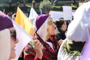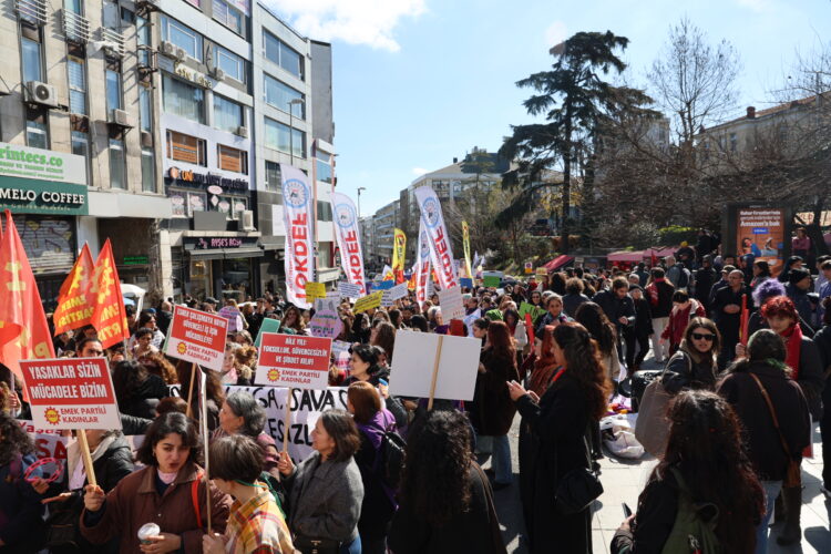Jin li pêşiya Peykera Bogayê kom bûn û bi kortejan dimeşin. Tevgera Jinên Azad (TJA) jî bi pankarta “Em bi berxwedanê jiyanekê azad û wekhev dihûnînin” dimeşe. Hevseroka DEM Partiyê Tulay Hatimogullari, parlamenterên DEM Partiyê û gelek jin di korteja TJAyê de cihê xwe girtin. Di meşê de dirûşmeyên “Jin jiyan azad” û “Bijî berxwedana jinan” berz dikin.