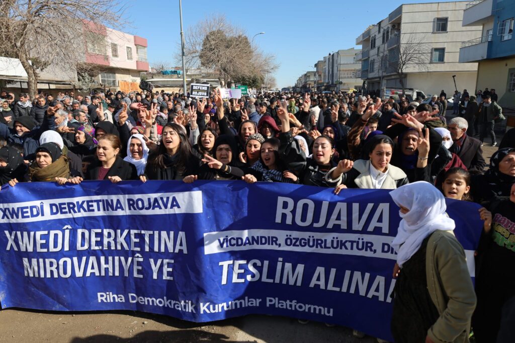 Li ser banga Platforma Saziyên Demomratîk li dijî êrişên çeteyên HTŞê, SMO û Tirkiyeyê yên ser herêmên Rêveberiya Xweser a Rojavayê li navçeya Wêranşara Rihayê meş hat lidarxistin. Endam û nûnerên partiyên siyasî, nûnerên saziyên demokratîk û ji 7 salî heta 70 salî bi hezaran welatî tev li meşê bûn. Girseya li ser rêya Amedê ya navçeya Wêranşarê kom bûne, heta Cadeya Olakê meşiyan. Di meşe de pankarta “Xwedî derketina Rojava xwedî derketina mirovahiyê ye” û “Rojava Xeta me ya Sor e” hat vêkirin.