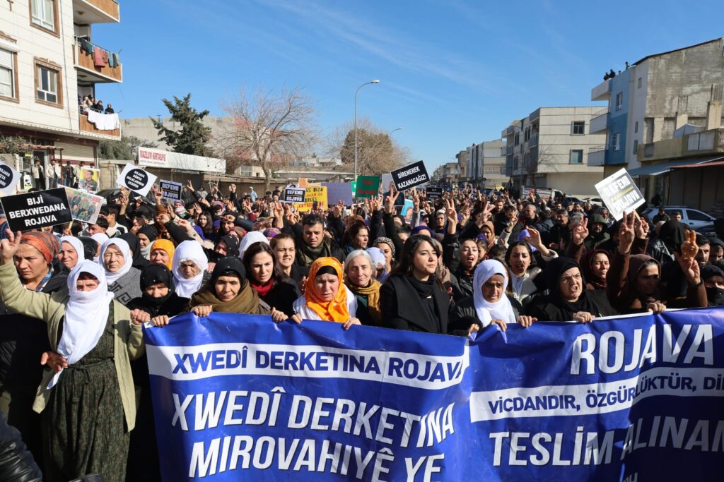 Bi hezaran kes di meşe de bênavber dirûşmên, “Bijî berxwedana Rojava”, “Şehîd namirin”, “Bijî berxwedana HSDê”, “Jin Jiyan Azadî”, “Rojava Rojhilat e Kurdistan yek welat e”, “Bijî Serok Apo” û “Rojava rûmeta me ye” berz kirin. Her wiha girsê, dovîzên Fermandar, şervan û cangoriyên HSDê, YPGê û YPJê rakirin. Girsê li Cadeya Olakê daxuyanî da. Daxuyaniyê ji bo cangoriyên di berxwedana Rojavayê de jiyana xwe ji dest danê bi deqeyeke rêzgirtinê dest pê kir.
