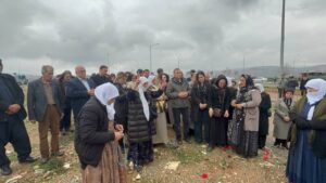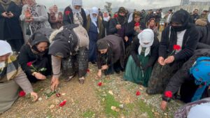 Piştî ku girse gihîşt goristanê ji bo kesên ku di têkoşîna azadiya Kurd de jiyana xwe ji dest dane deqeyek rêz girt. Dûre girseyê serdana goran kir û goran bi qurnefîlan xemiland.