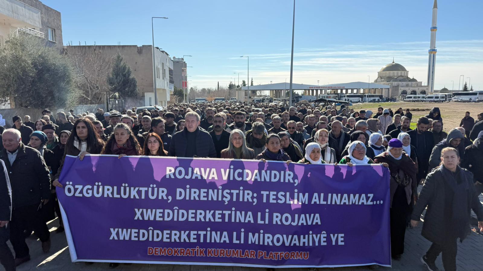 Bi pêşengiya Platforma Saziyên Demokratîk, bi tevlibûna Hevserokê DEM Partiyê yê Giştî Tûncer Bakirhan û Hevseroka DBPê ya Giştî Çîgdem Kiliçgun Ûçar, parlamenterên DEM Partiyê, hevşaredar, endam û rêveberên saziyên sivîl en civakî û deh hezaran kes li ber Goristana Hecacê ya li navenda navçeya Nisêbînê kom bûn. Girseyê bi diruşmên, “Rojava rûmet e rûmeta gelê Kurd e” û “Bijî berxwedana Rojava” dest bi meşê kir./…