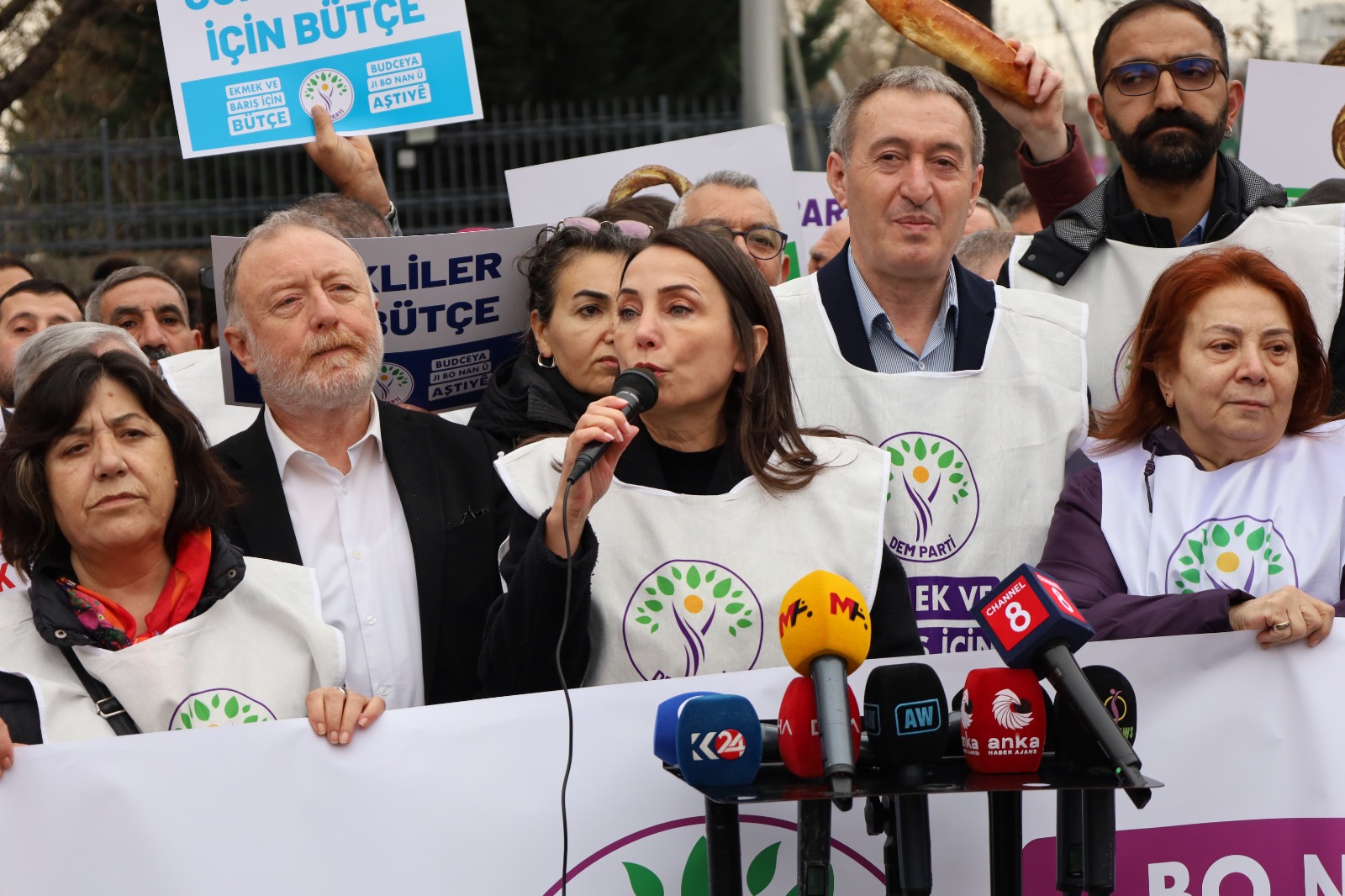 Hevseroka Giştî ya DEM Partiyê Tulay Hatîmogullari li vir axivî û silav ji meşvanên 4 baskan meşiyan û karkeran kir. Tulay Hatîmogullari bi lêv kir ku budçe ji şer re hatiyê veqetandin û wiha axivî: “Niha li meclisê budçe tê axaftin em jî li vir dibêjin; em li vê budçeyê re dibêjin na. Di wê budceyê de mafê karker, cotkar, jin û ciwanan tune ye. Em jî ji ber wê ji vê budçeyê re dibêjin na. Di budçeyê de bijîşk û karmend tune ne. Îro li Tirkiyeyê enflasyoneke mezin heye. Ew jî tê wateya bihabûn, bêkarî û xizaniyê. Li sermayeyê bacê nagirin û hemû bar dane ser karker û cotkaran. Em vê yekê qebûl nakin. Her tim em ê bêjin ji ked û aştiyê re budçe. Em dibêjin aştî û dibêjin êdî dawî li budçeya şer bînin. Ji bo careseriya pirsgirêka Kurdan hewceye ji çekan re budçe neyê veqetandin. Lê mixabin îsal jî tevî pêvajoya astiyê jî budçeyeke zêde ji şer re hat veqetandin. Weke DEM Partî em li dijî vê derketin û me xwest ji aştî û kedê re budçe bê veqetandin.”