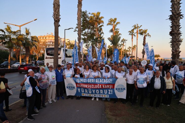 Konfederasyona Sendikaya Kedkarên Cemaweriyê (KESK) li dijî bêhiqûqiya KHKiyan bi dirûşma “Em ê karê xwe bi paş ve bistînin” di 13ê Cotmehê de ji Amedê ber bi Enqereyê ve dest bi meşê kir. Meş sê roje berdewam dike. Meşvan di roja seyemîn de ewilî çûn Edeneyê paşê ji gihîştin Mêrsînê.