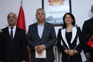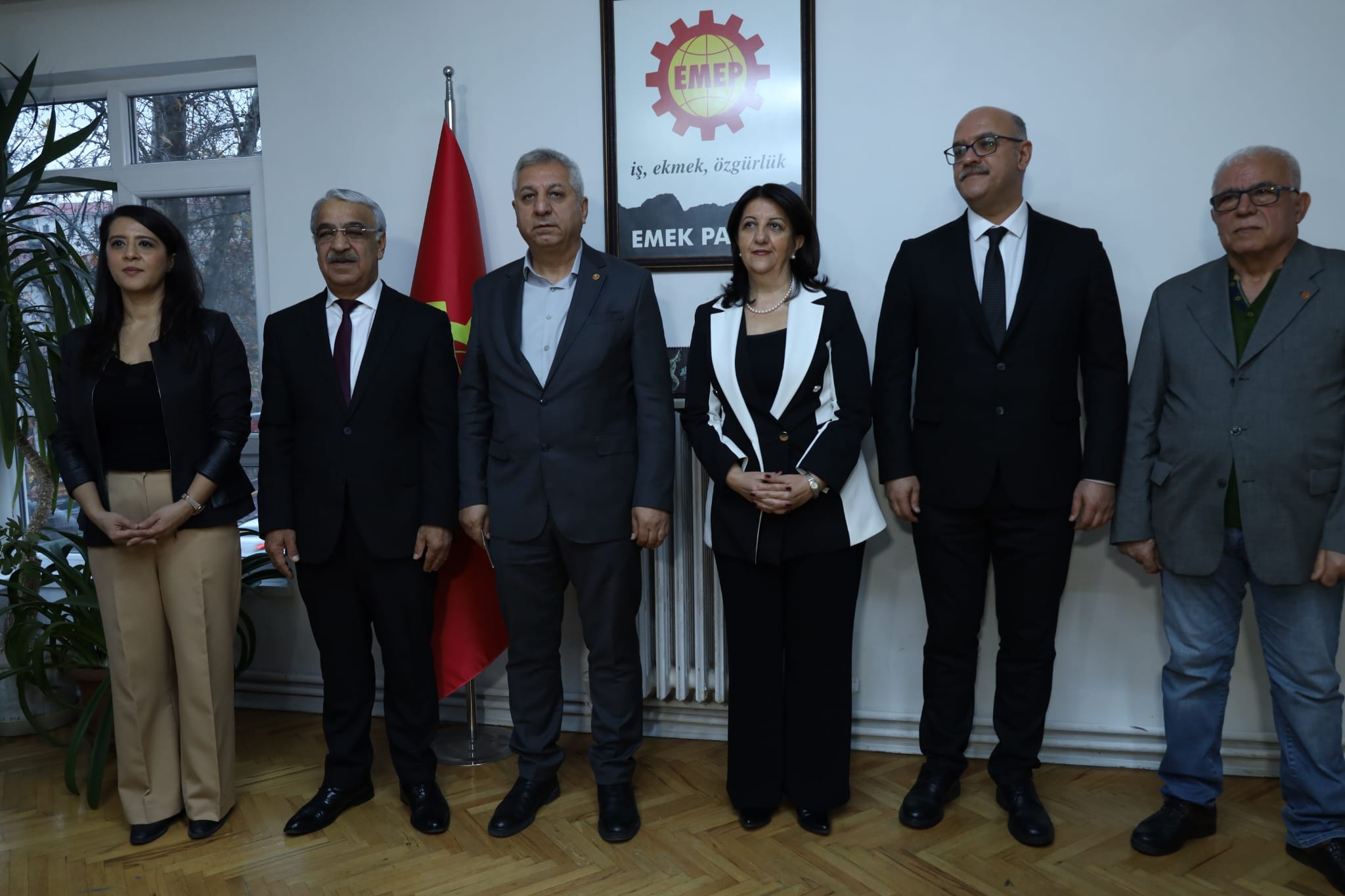 Endamên Heyeta Partiya Wekhevî û Demokrasiyê ya Gelan (DEM Partî) ya Îmraliyê ku ji parlamentera Wanê Pervîn Buldan, parlamenterê Rihayê Mîthat Sancar û parêzerê Buroya Hiqûqê ya Sedsalê Faîk Ozgur Erol pêk tên tekildarî pêvajoya Aştî û Civaka Demokratîk serdanên partiyên siyasî didomînin. Heyetê piştî CHPê serdana Navenda Giştî ya EMEPê kir. Endamên heyetê li Navenda Giştî ya EMEPê ji aliyê Serokê Giştî yê EMEPê Seyît Aslan û parlamentera Dîlokê ya EMEPê Sevda Karaca ve hatin pêşwazîkirin û piştre derbasî cihê hevdîtinê bûn.