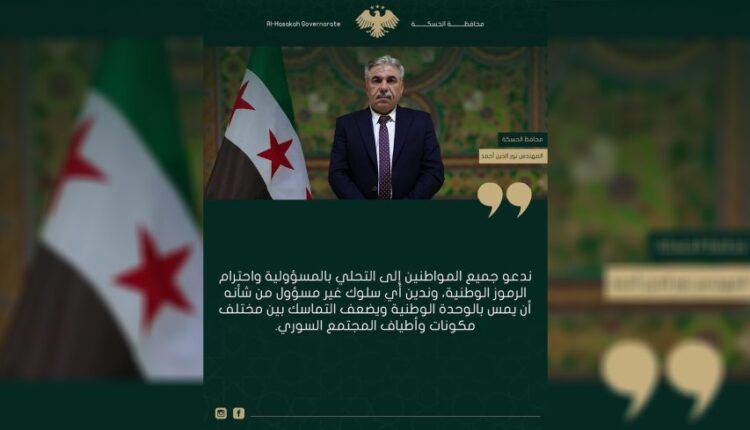 Li gorî malpera nivîsgeha parêzgarê Hesekê, Parêzgar Nûredîn Ehmed bang li hemû welatiyan kir ku bi ruhê berpirsyariyê tev bigerin û rêz nîşanî sembolên neteweyî bidin. Nûredîn Ehmed nêzîkatiyên ku yekitiya nîştimanî xirab dike û girêdana di navbera pêkhateyên civaka Sûriyeyê qelis dikin, şermezar kir.