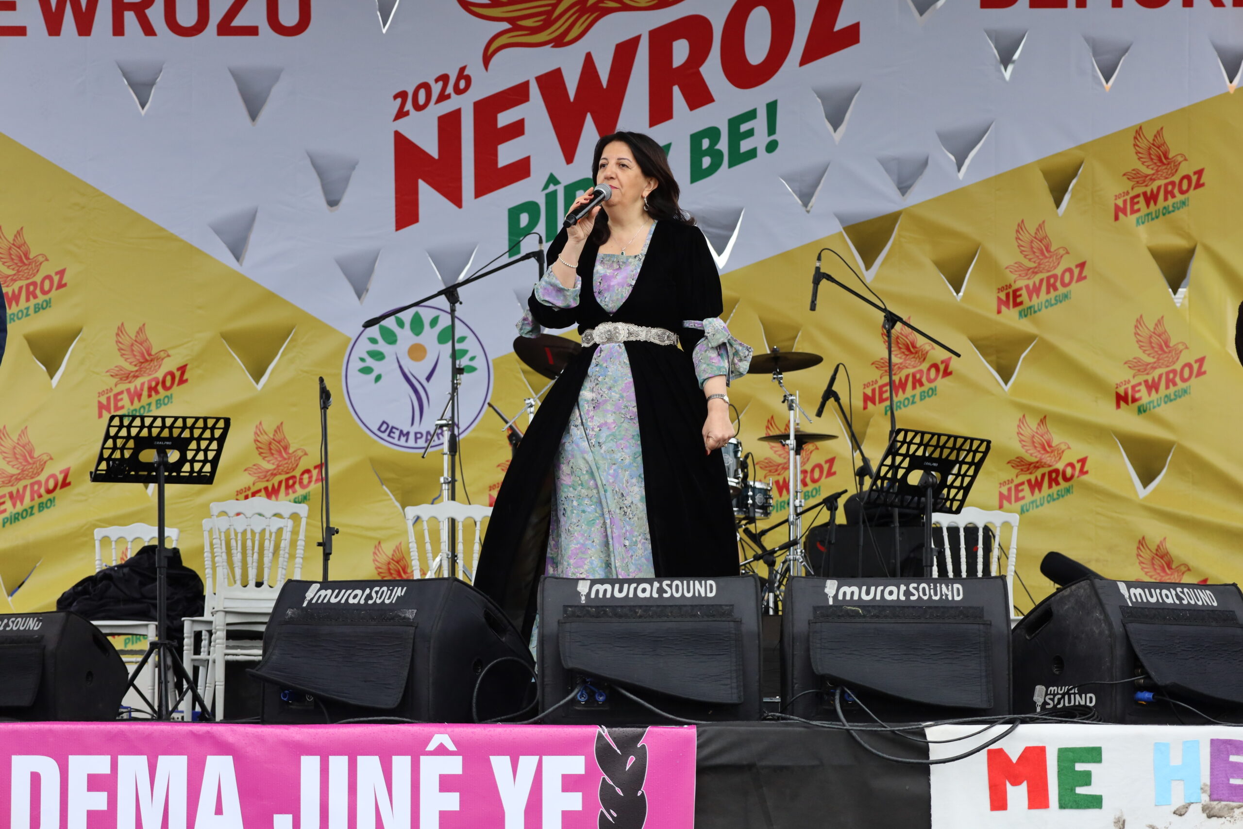 Dû re Serokwekîlê Koma DEM Partiyê Sezaî Temellî axivî. Sezaî Temellî ku girse silav kir, Newroza girseyê pîroz kir û wiha got: “Silav ji her kesên ku agirê Newrozê gur dikin û vê têkoşînê dimeşînin re. Silav ji wan kesên ku di vê têkoşînê de jiyana xwe ji dest dane. Silavên mezin jî ji birêz Ocalan re ku ev rêye vekiriye. Li dijî polîtîkayên îmha, înkar û asîmîlasyonê yên sed salan. Dema avakirina pêşeroja ku birêz Ocalan daniye holê ye. Azadiya birêz Ocalan, azadiya gelê me û gelên Rojhilata Navîn hatine asteke girîng. Em bi Newrozê dest bi sedsaleke nû dikin. Werin em kolan, gund û taxan bi rêxistin bikin û rêya 3yemîn ava bikin. Em ê bi hev re tekoşîna gel a mezin ava bikin û sîstema kedxwar ji holê rakin. Li Kurdistanê qasî ku zext û zordarî heye, berxwedan jî heye. Em ê vê berxwedanê mezin bikin û serbikevin. Em ê di rêwîtiya 27ê Sibatê de mil bi mil bi piştgiriyê bi ser bikevin. Em jiyaneke newekhev qebûl nakin. Bêyî yekitiyê, şansê vê têkoşînê ji bo serketinê tune ye. Divê em bibin yek û têkoşînê bilind bikin. Em rêwiyên Rêya Sêyemîn in.”