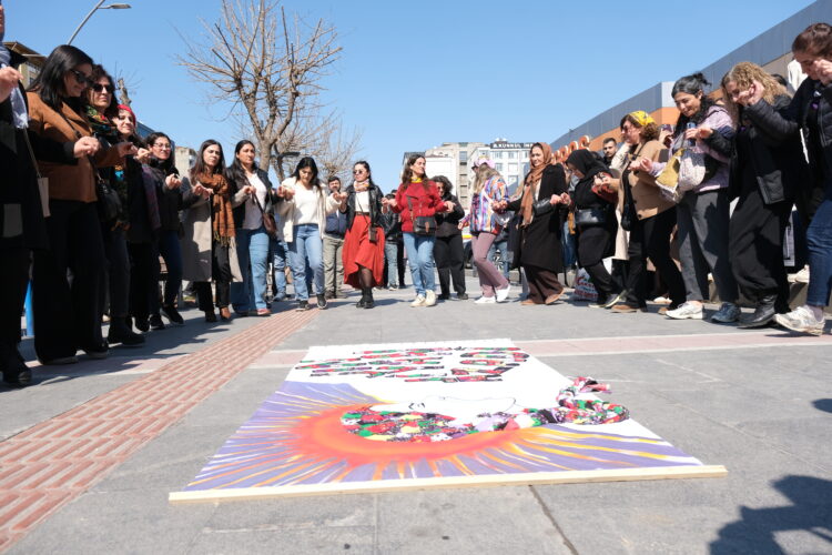 Jinên beşdarî çalakiyan bûne bi hev re tayên ben wek keziyan por honandin û bi tayên honandî meş li dar xistin. Her wiha jinan dovîzên ku li ser “Gulistan Dokû li kurê ye”, “Rojava ne bi tenê ye”,” Peymana Stenbolê dide jiyîn”, “Bijî Berxwedana Jinan”, “Bijî yekîtî”, “Jin Jiyan Azadî”, “Keda ku nayê dîtin navê wê jin e” û “Piştgiriya bi hev re baş dike, bi hev re tê guherandin” dinivîsand hatin hilgirtin. Jinan gelek caran bê navber diruşmeyên “Jin Jiyan Azadî”, “Bijî yekiya Jinan” berz kirin. Di çalaiyê de pankarta “Jin Jiyan Azadî” hat vekirin. Metna daxuyaniyê Hevseroka Egîtîm-Senê Jale Dogan Yildiz xwend.