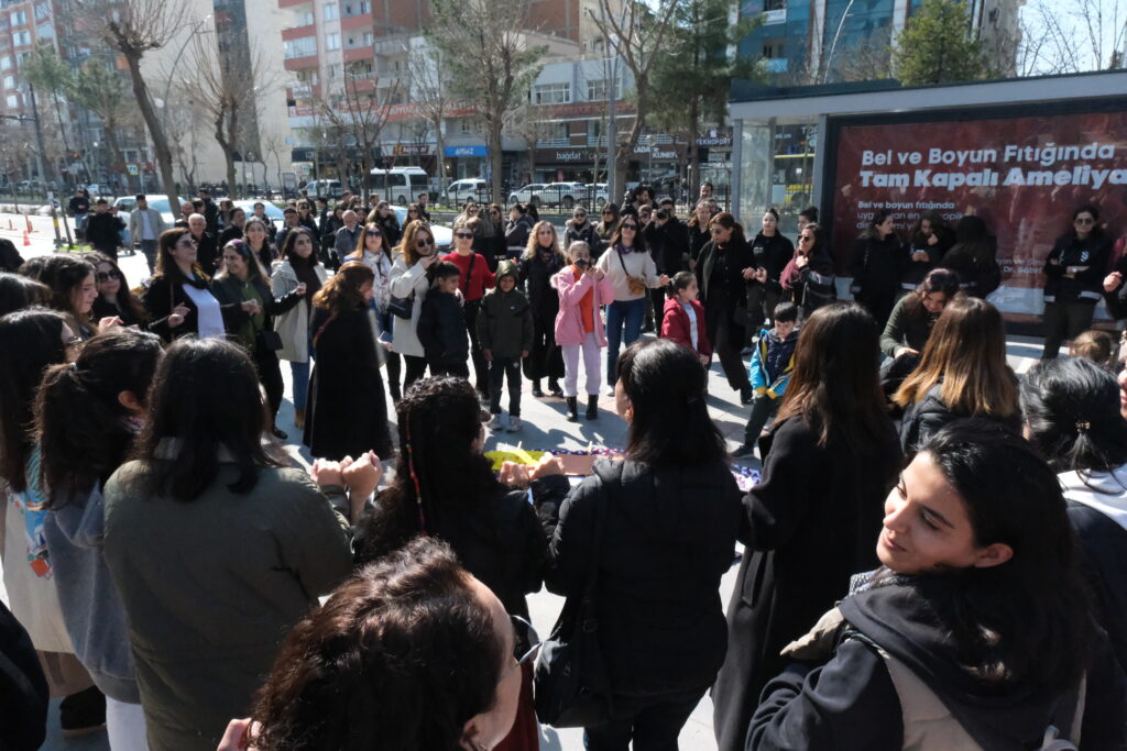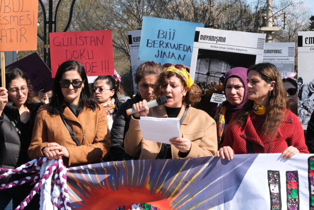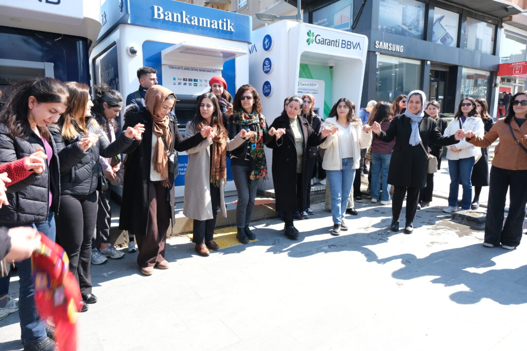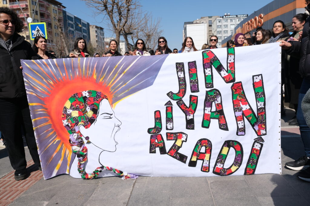 Jinên beşdarî çalakiyan bûne bi hev re tayên ben wek keziyan por honandin û bi tayên honandî meş li dar xistin. Her wiha jinan dovîzên ku li ser “Gulistan Dokû li kurê ye”, “Rojava ne bi tenê ye”,” Peymana Stenbolê dide jiyîn”, “Bijî Berxwedana Jinan”, “Bijî yekîtî”, “Jin Jiyan Azadî”, “Keda ku nayê dîtin navê wê jin e” û “Piştgiriya bi hev re baş dike, bi hev re tê guherandin” dinivîsand hatin hilgirtin. Jinan gelek caran bê navber diruşmeyên “Jin Jiyan Azadî”, “Bijî yekiya Jinan” berz kirin. Di çalaiyê de pankarta “Jin Jiyan Azadî” hat vekirin. Metna daxuyaniyê Hevseroka Egîtîm-Senê Jale Dogan Yildiz xwend.