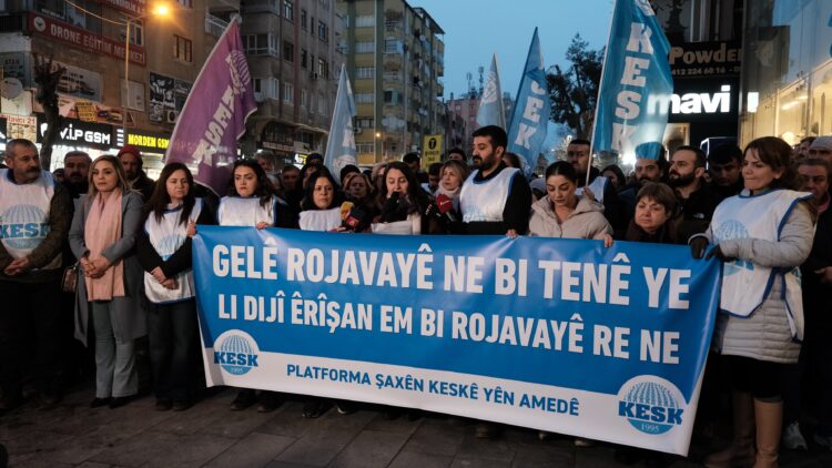 Platforma Şaxên Amed a Konfederasyona Sendîkayên Karmendên Giştî (KESK) li ber AZC Plaza li taxa Ofîs a navçeya Bajarê Nû ya Amedê bi dirûşmeya “Em bi gelê Rojava re ne” daxuyanî da. Daxuyaniya ku gelek kes tevlîbû de pankarta “Gelê Rojava ne bi tenê ye, li dijî êrişan em bi Rojava re ne” hate hilgirtin û dirûşmeyên “Bijî berxwedana Rojava”, “Kujer HTŞ, ji Rojava biceheme” û “Bijî berxwedana gelê Kurd” hatin berzkirin.