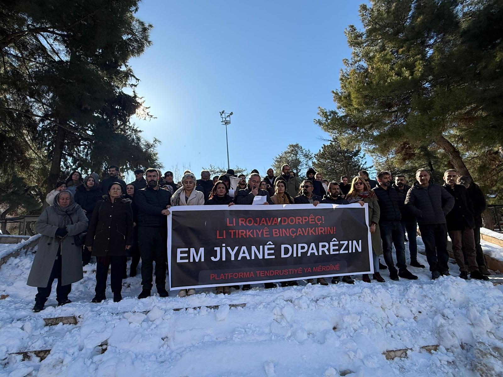 Endam û nûnerên Platforma Tenduristiyê ya Mêrdînê li Parka Karayolu ya Mêrdînfê daxuyanî da. Parlamenterên DEM Partiyê û nûnerên saziyên civakî jî beşdarî daxuyaniyê bûn. Di çalakiyê de pankarta “Li Rojava dorpêçî, li Tirkiyeyê binçavkirin. Em jiyanê biparêzin” vekirin. Li ser navê Platformê Bijîşk Kamuran Yildirim daxuyanî da.  Kamuran Yildirim, li ser navê Platformê diyar kir ku ew wekî kedkarên tenduristiyê û qada tenduristiyê dixwazin li dijî dagirkirina Tirkiyeyê dengê xwe bilind bikin û got: “Bûyerên îşkence, muameleyên xerab raste rast bandorê li ser mafê mirovan ê tenduristiyê dike. Ev êrîşên li dijî mafên tenduristiyê ne.”
