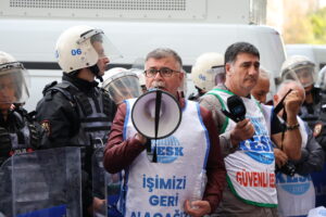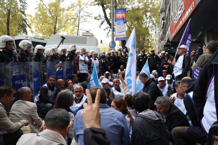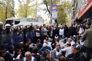 Polîsan meşvanan û girseyê pêşiya navenda giştî ya SESê dorpeç kir. Meşvan xwestin bimeşin û polîsan êrîşî wan kir. Dijî êrîşê girse dest bi çalakiya rûniştinê kirin. Di nav dorpeça polîsan de girse dirûşmeyan “Bijî berxwedana karkeran”, “Dê KHKê herin em ê bimînin” berz kirin û govend gerandin. Di nav dorpeçê de hevserokên giştî yên KESKê axivîn.
