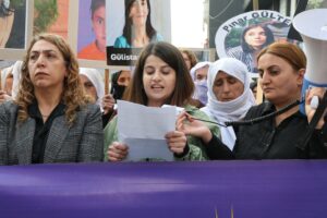 Piştî çalakiya rûniştinê Aktîvîsta Tevgera Jinên Azad (TJA) Rengîn Onûk daxuyanî xwend. Rengîn Onûk hemû jinên ji aliyê tundiya mêrserwer ve hatine qetilkirin bi bîr anî û wiha axivî: “Em îro bi rêzdarî, hemû jinên ku ji aliyê şîdeta mêrserwer ve hatine qetilkirin, ji Roza Luxemburg heta Sakîne Cansiz, Nagîhan Akarsel, Sêvê Demîr, Pakîze Nayir, Fatma Ûyar, Taybet Înan, Cemîle Çetîn, Asya Yuksel, Evîn Goyî û bi hezaran hevalên me yên ku navên wan bûne sembola têkoşînê ya bêdawî, bi bîr tînin û em mînetdarê têkoşîna wan in. Soza me ev e ku em ê mîrasa wan a têkoşînê, bi avakirina jiyaneke li ser bingeha azadiya jinê, aştî û wekheviyê tacîdar bikin.”