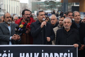 Hevberdevkê platformê Engîn Işik metna daxuyaniyê xwend. Engîn Işik diyar kir ku sê caran li dijî îradeya gelê Wanê qeyûm hatine tayînkirin û got: “Ev hewldana desteserkirina îrade di serî de îradeya gelê Wanê, nûnerên wan ên hilbijartî û meclîsên wan paşguh dike. Yên ku bi salan e bi berdewamî behsa îradeya gel dikin, niha israr dikin ku wê îradeyê desteser bikin. Vê pratîka dij-demokratîk li Wan, Mêrdîn, Êlih, Dêrsim, Qaxizman û gelek deverên din şaredarî ji gel girtine. Li Wanê, meclîsên şaredariyan jî bêfonksiyon mane. Rêveberiya şaredariyê bêyî demokrasiya herêmî, şefafî û hesabdayînê nayê kirin. Qeyûm tê wateya pirsgirêkan. Ev zîhniyeta qeyûm, ku 10 sal in di şaredariyên me de cih digire, sedema sereke ya hemû pirsgirêkên li Wanê ye. Pirsgirêkên pir bingehîn ên ku dikarin bi îradeya gel, bi hesabdayînê û bi nûnerên wan ên hilbijartî werin çareser kirin, ji hêla rejîma qeyûm ve hatine girankirin. Hikûmeta AKPê ji bersiva 14-0 a ku di 31ê Adarê de li sindoqan hat dayîn û ji bersiva ku gelê Wanê di bûyerên mazbatayê de daye nîşandan, dersa pêwîst negirtiye. Gelê me dê di hilbijartinên giştî de bersivek hîn bihêztir bide wan.”