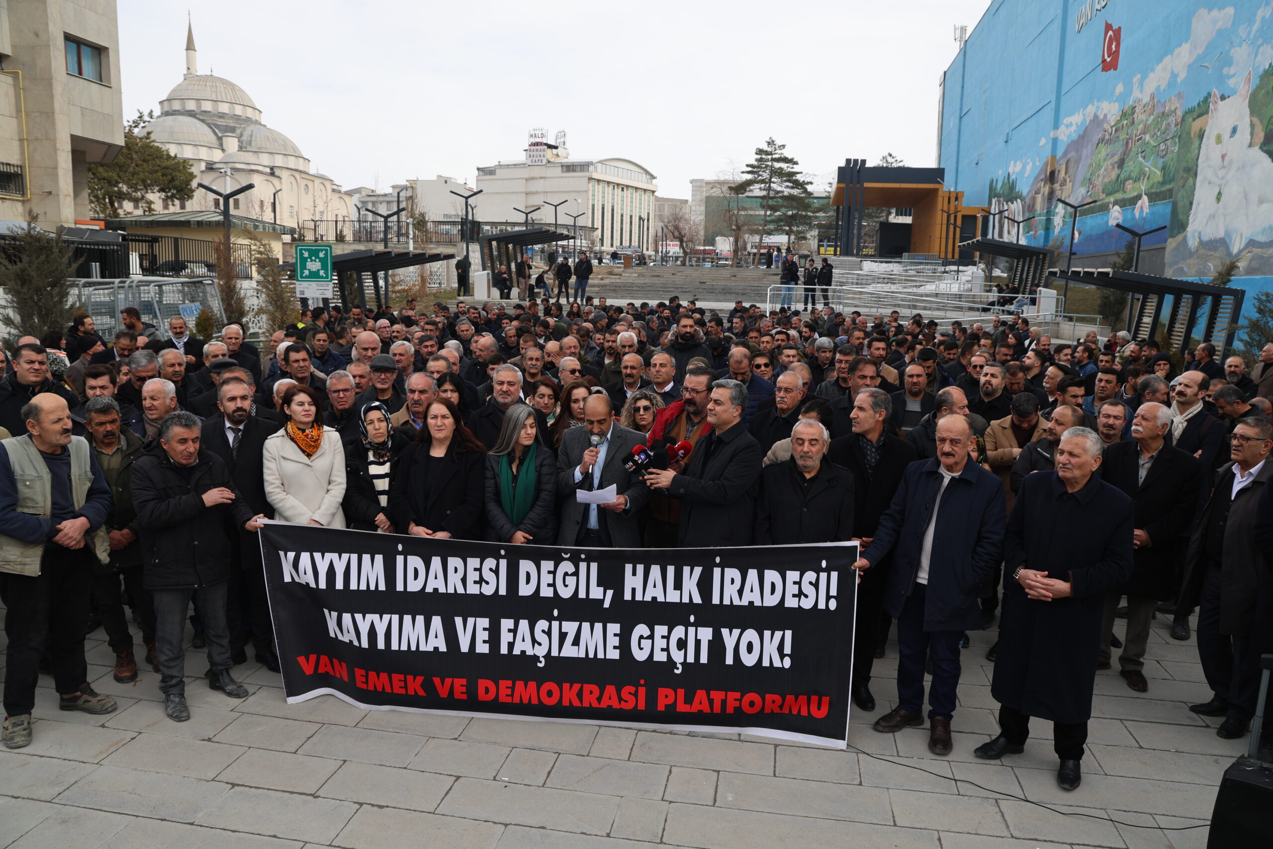 Hevberdevkê platformê Engîn Işik metna daxuyaniyê xwend. Engîn Işik diyar kir ku sê caran li dijî îradeya gelê Wanê qeyûm hatine tayînkirin û got: “Ev hewldana desteserkirina îrade di serî de îradeya gelê Wanê, nûnerên wan ên hilbijartî û meclîsên wan paşguh dike. Yên ku bi salan e bi berdewamî behsa îradeya gel dikin, niha israr dikin ku wê îradeyê desteser bikin. Vê pratîka dij-demokratîk li Wan, Mêrdîn, Êlih, Dêrsim, Qaxizman û gelek deverên din şaredarî ji gel girtine. Li Wanê, meclîsên şaredariyan jî bêfonksiyon mane. Rêveberiya şaredariyê bêyî demokrasiya herêmî, şefafî û hesabdayînê nayê kirin. Qeyûm tê wateya pirsgirêkan. Ev zîhniyeta qeyûm, ku 10 sal in di şaredariyên me de cih digire, sedema sereke ya hemû pirsgirêkên li Wanê ye. Pirsgirêkên pir bingehîn ên ku dikarin bi îradeya gel, bi hesabdayînê û bi nûnerên wan ên hilbijartî werin çareser kirin, ji hêla rejîma qeyûm ve hatine girankirin. Hikûmeta AKPê ji bersiva 14-0 a ku di 31ê Adarê de li sindoqan hat dayîn û ji bersiva ku gelê Wanê di bûyerên mazbatayê de daye nîşandan, dersa pêwîst negirtiye. Gelê me dê di hilbijartinên giştî de bersivek hîn bihêztir bide wan.”