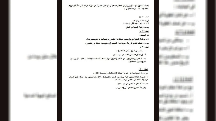 Bi boneya Cejna Newrozê û Remezanê Rêveberiya Xweser a kantona Cizîrê efûyek giştî der barê kesên sûc beriya 18/3/2026an kirine derxist.