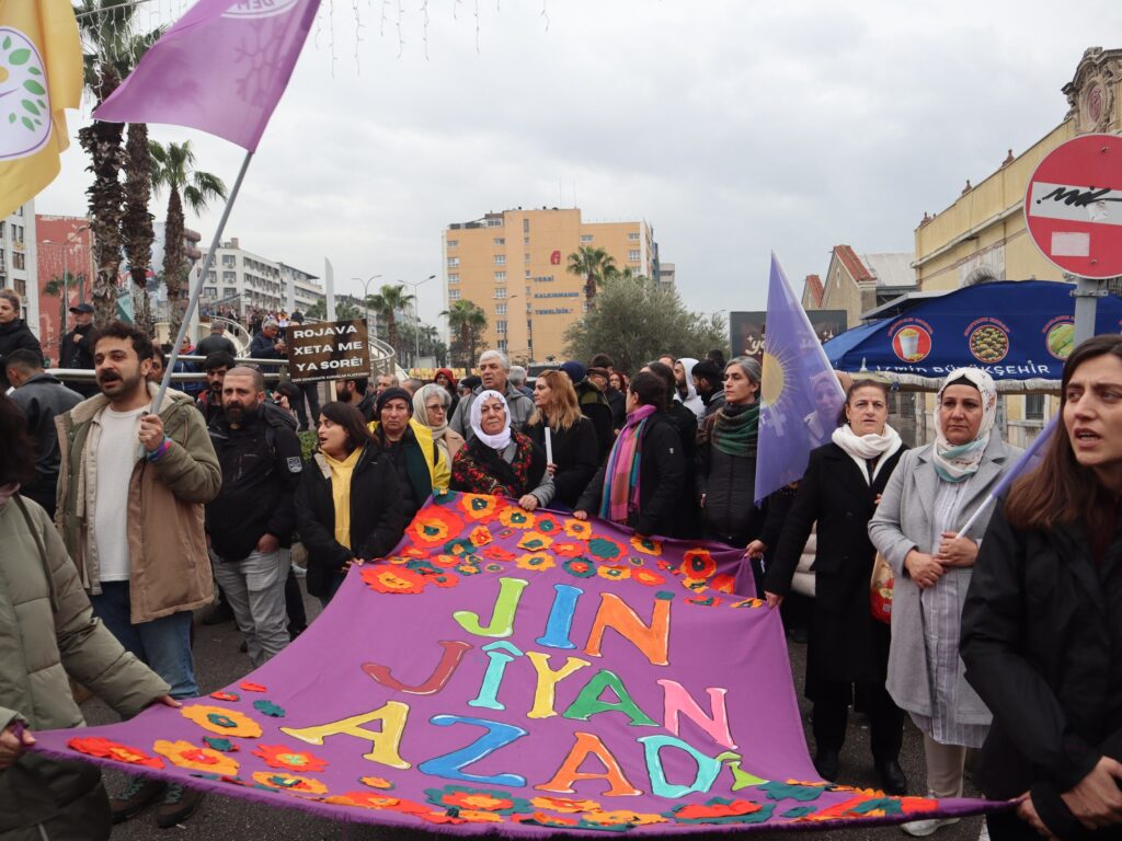 Li ser banga Platforma Saziyên Demokratîk a ji bo 1ê Sibatê Roja Piştevaniya bi Rojava re ya Cîhanê bi sedan kes li ber Konak Pierê hatin cem hev, girseya ku ji bo piştevaniya Rojavayê Kurdistanê gihîştibû hev, pankarta ‘Rojava berxwedan e, têkoşîn e, azadî ye. Nayê teslîmgirtin’ vekir û dovîzên ‘Rojava xeta me ya sor e’ bilind kirin û gelek caran dirûşmeyên ‘Avakarê aştiyê li Îmraliyê ye’, ‘Bi can bi xwîn em bi te re ne ey Serok’ û ‘Bijî berxwedana Rojava’ berz kirin. Digel barana zêde jî girseyê qad ne terikand û ber bi qada Cumhuriyetê ve meşiya. Polîsan rê li ber girseyê girt û êriş bir ser girseyê. Girse tevî astengiya polîsan jî bi dirûşmeyan meşa xwe domand.