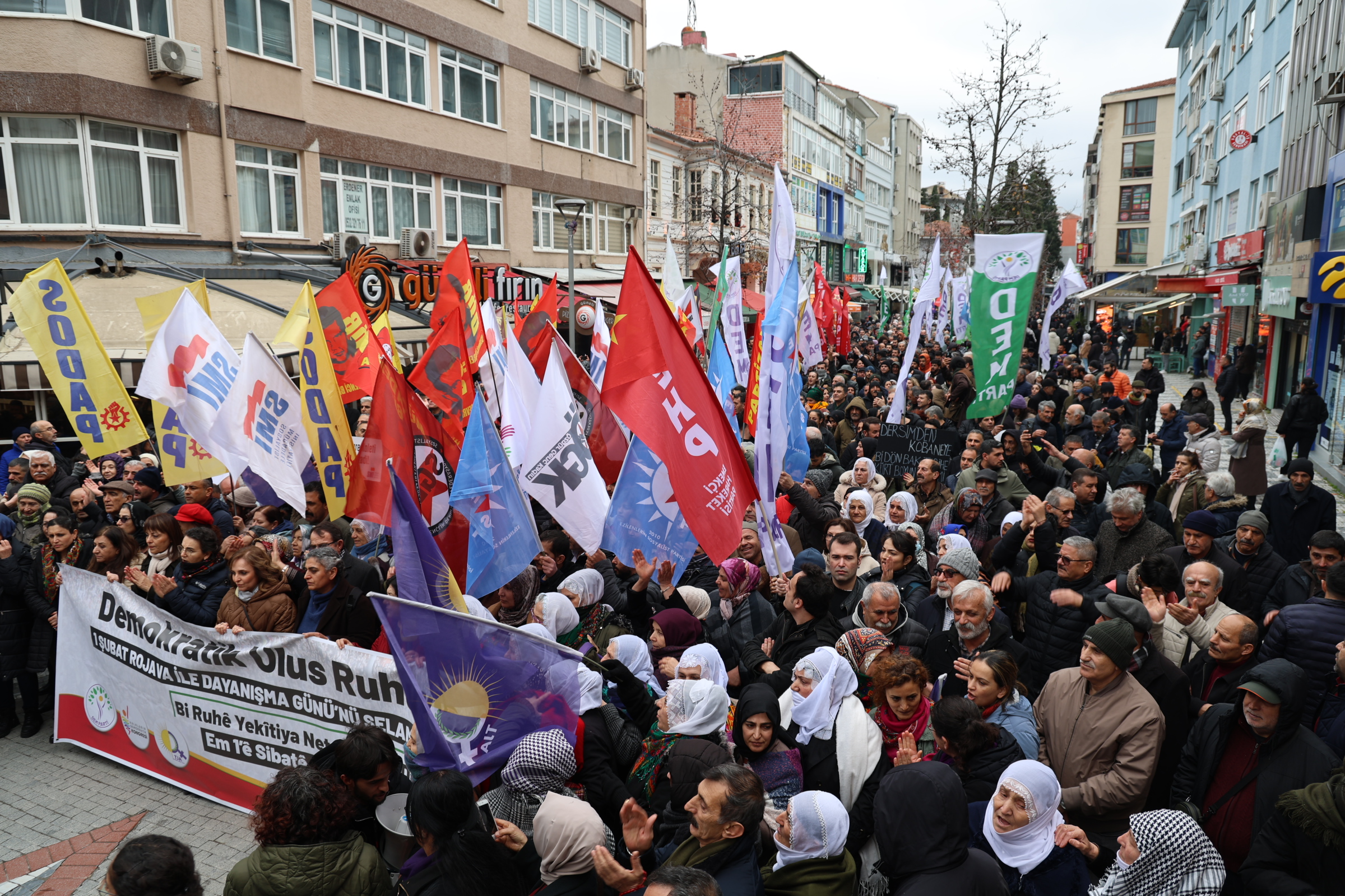 DEM Partî, TJA û HDK ji bo 1ê Sibatê “Roja Piştevaniya bi Rojava re ya Cîhanê” li Stenbolê meş lî dar xistin. Ayşegul Dogan di daxuyaniyê de axivî û got: “Di nava dilê me de tu wateya sînoran nîn e.”