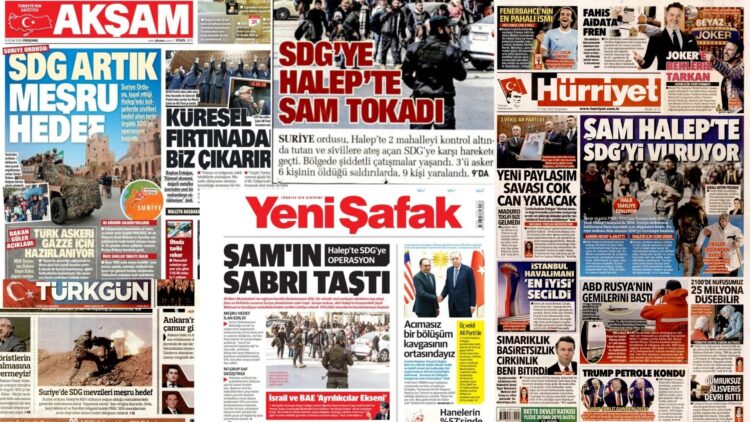Yenî Şafak: Vê rojnameyê jî êriş bi sernavê “Sebrê Sûriyeyê êdî nema” weşand. Di naveroka nûçeyê de îdia dike ku HSDê sivîlên li Helebê bi ÎHA, top û fuzeyan hedef girtiye. Her wiha îdia dike ku HSD bi Peymana 10ê Adarê nake, xwe fesix nekiriye û bi vî awayî hewl da êrişên li dijî HSDê meşrû nîşan bide.